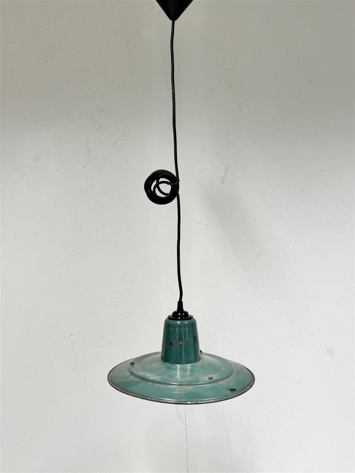 Vihreä vintage teollisuusvalaisin 60 luvulta, joka on valmistettu emaloidusta metallista. Valmistaja oletettavasti Polam Wilkasy Puola. Valaisimessa on yksinkertainen ja toimiva muotoilu, joka sopii hyvin teolliseen tyyliin. Valaisimen yläosassa on valkoinen muovinen kattokuppi ja valkoinen johto. Valaisimen varjostin on leveä ja matala, mikä antaa laajan valokeilan.