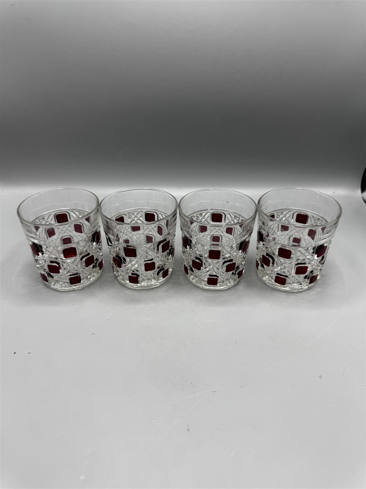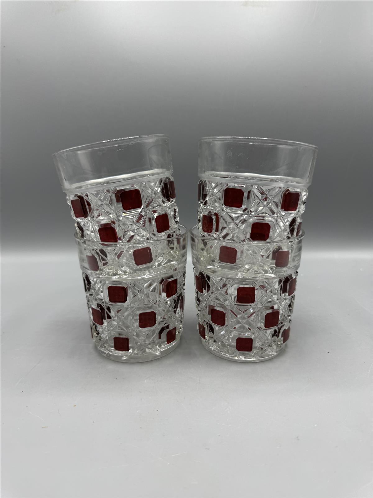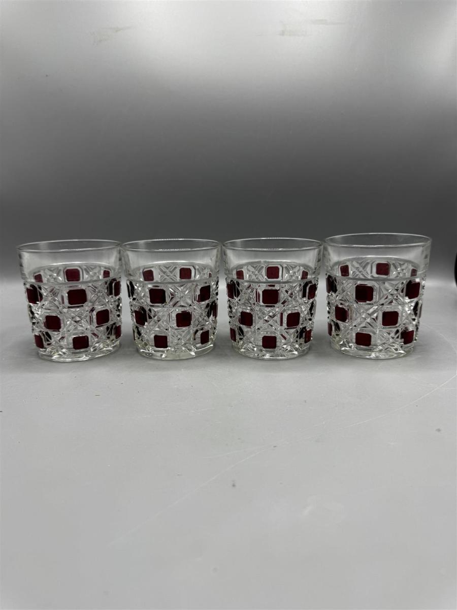 Neljä vintage-tyylistä juomalasia, joissa on koristeelliset punaiset yksityiskohdat. Lasit ovat kirkasta lasia ja niissä on geometrinen kuviointi.