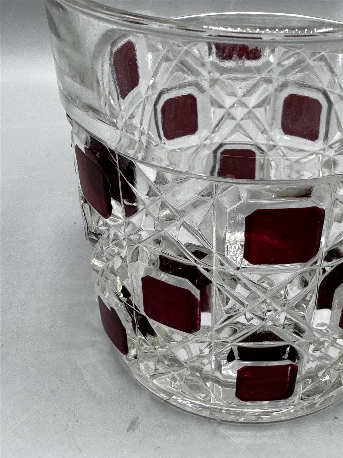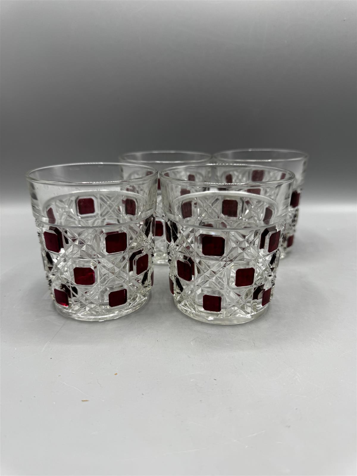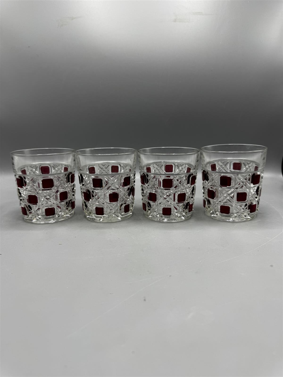 Neljä vintage-tyylistä juomalasia, joissa on koristeelliset punaiset yksityiskohdat. Lasit ovat kirkasta lasia ja niissä on geometrinen kuviointi.