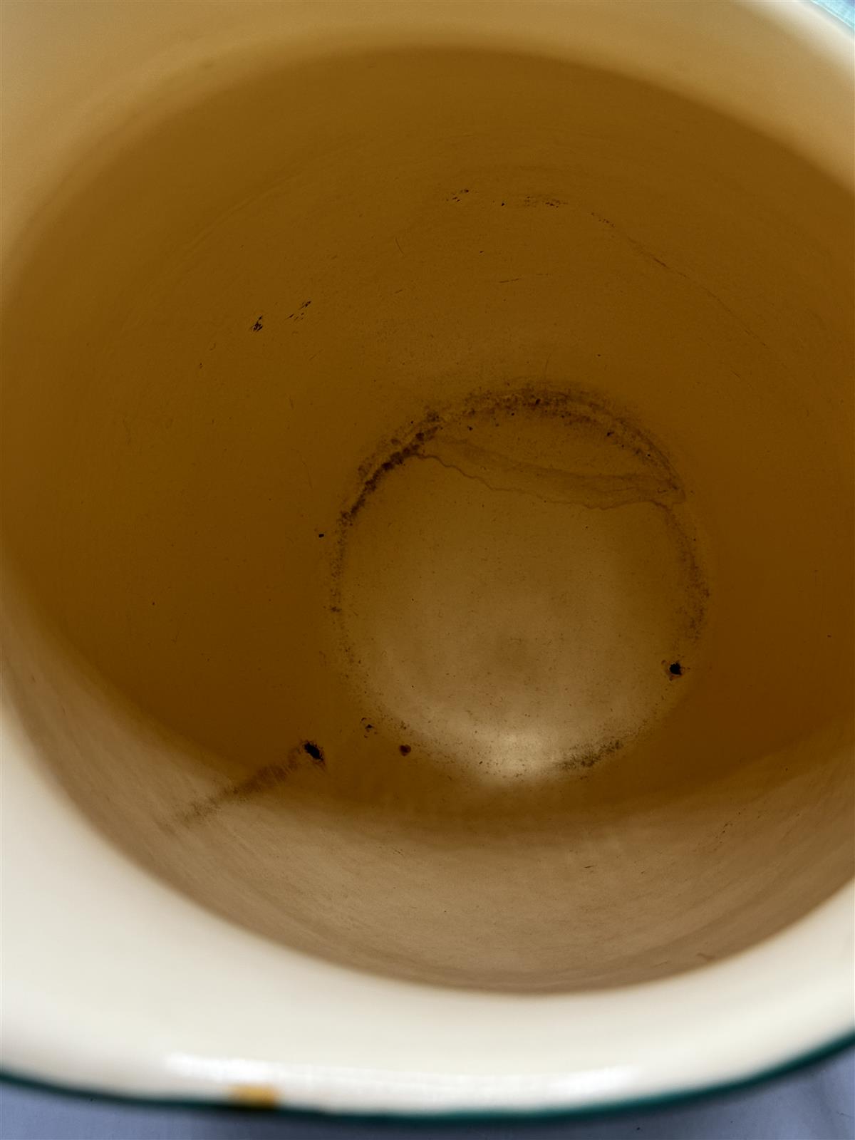 Kannu on kulunut ja siinä on näkyviä naarmuja sekä pieniä kolhuja. Vihreässä kahvassa on kulumaa, ja sisäpuolella on selkeitä merkkejä käytöstä. Yleisilmeeltään kannu on kuitenkin ehjä ja käyttökelpoinen.