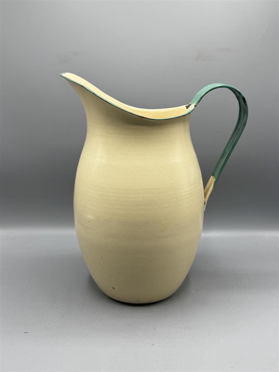 Kellertävä vintage emalikannu, jossa on vihreä kahva. Kannu on valmistettu metallista ja siinä on kaareva muotoilu, joka tuo esiin sen vanhan ajan viehätyksen, pinta emaloitu. Sisäpuolella on havaittavissa käytön jälkiä ja tummentumia, jotka kertovat sen historiasta.