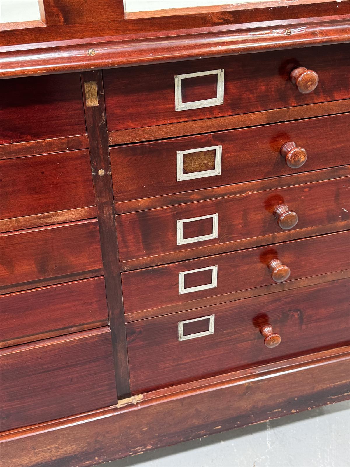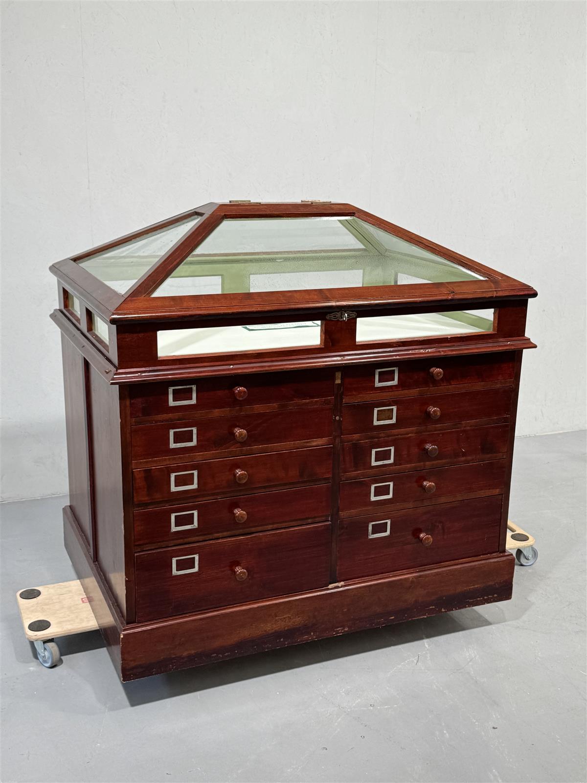 Harvoin tarjolla oleva apteekkarin tai korukauppiaan vintage vitriini kaksipuolinen lipasto. Jykevä puurunko, jossa pinta ruskeaksi maalattu. Alaosassa on useita vetolaatikoita, joissa kylttipaikat ja yläosassa kulmikas, lukollinen ja avattava lasikansi. Tämä monikäyttöinen huonekalu sopii erinomaisesti säilytykseen ja esillepanoon liiketilassa. Lipasto huokuu vanhan ajan charmia ja käytännöllisyyttä, todella raskas.