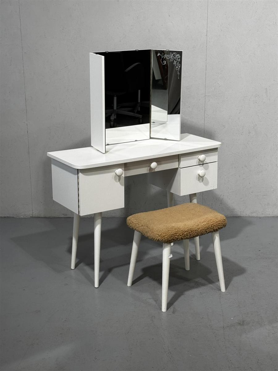 Vintage kampauspöytä, jossa on kolmeosainen kasvopeili ja alaosassa kaappi sekä kolme vetolaatikkoa. Mukana on teddykankaalla pehmustettu jakkara. Pöydän ja jakkaran jalat ovat kapeat ja pyöreät.
