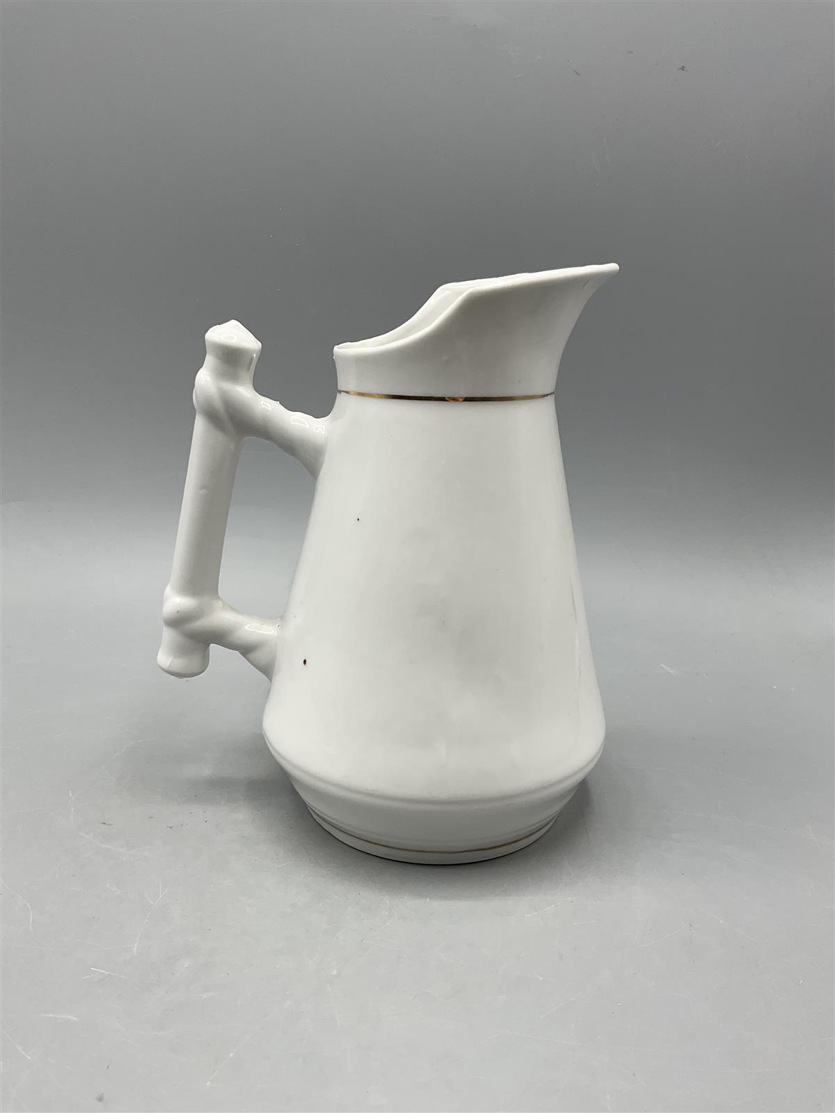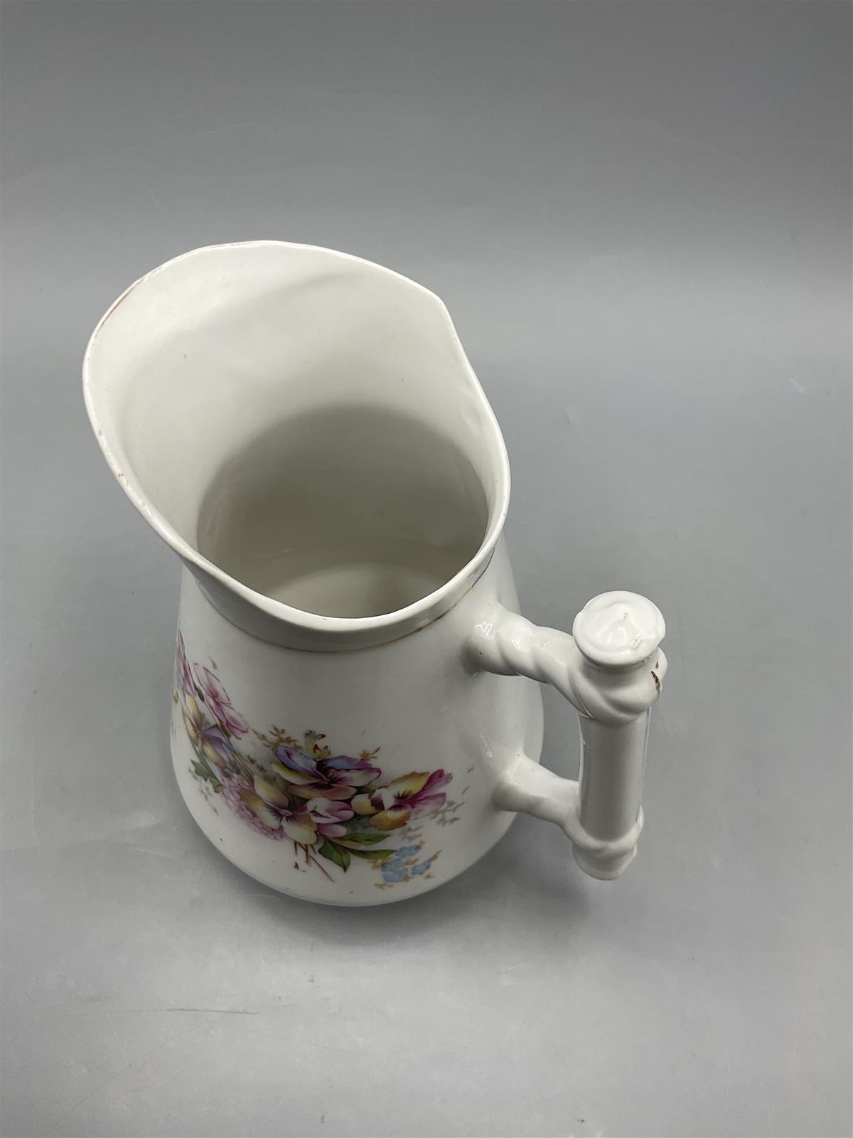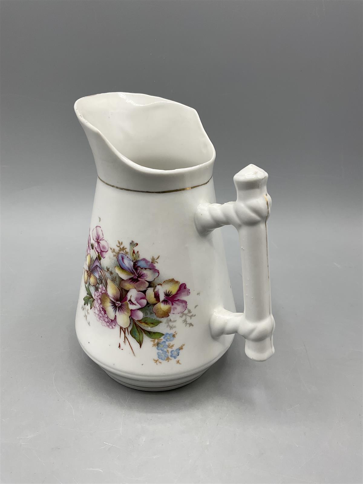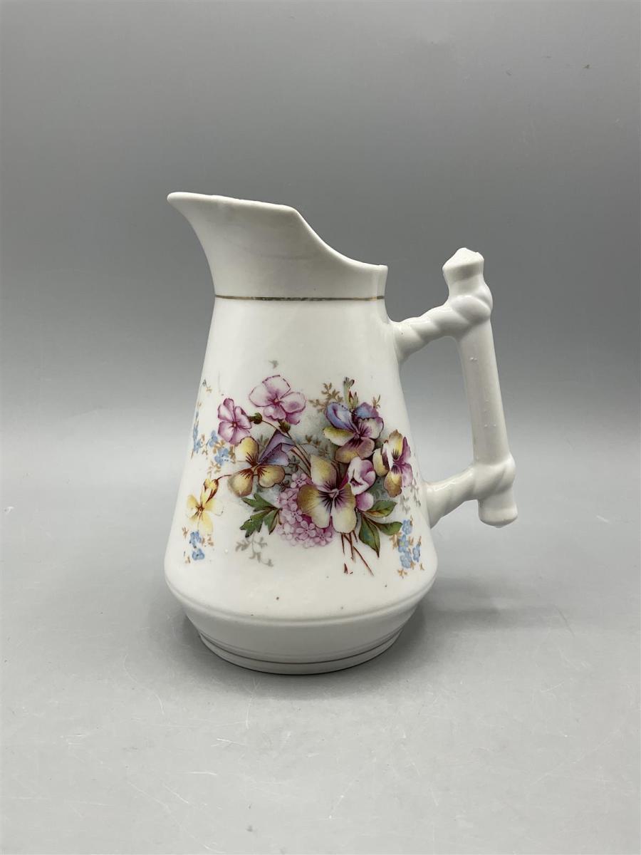 Vintage kannu posliinista, jossa on kauniit kukkakuviot. Kannussa on koristeellinen kahva ja leveä kaatonokka.