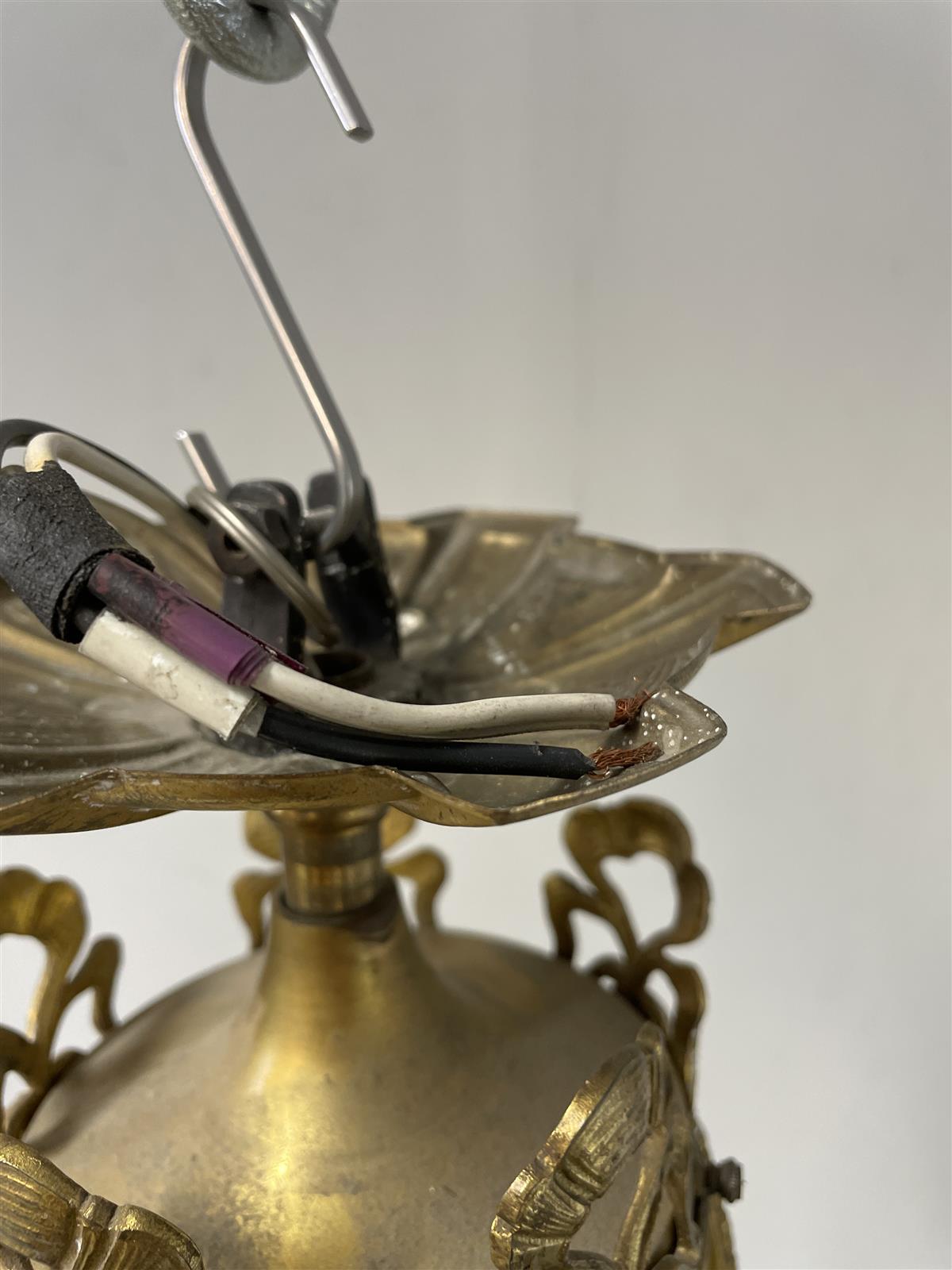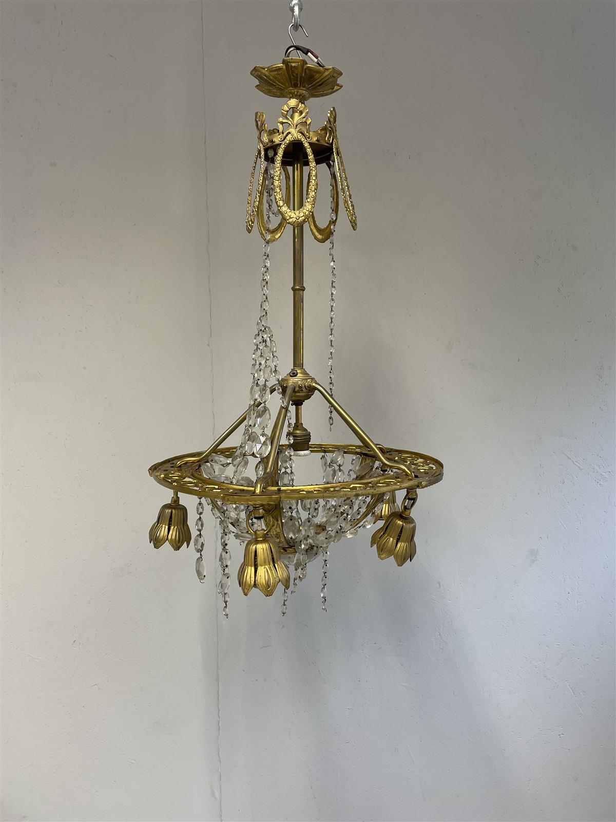 Kunto on kohtalainen, mutta metalliosissa on näkyvää kulumaa ja patinaa. Joitakin kristalleja saattaa puuttua. Kristalliriipuksia irti rungosta.