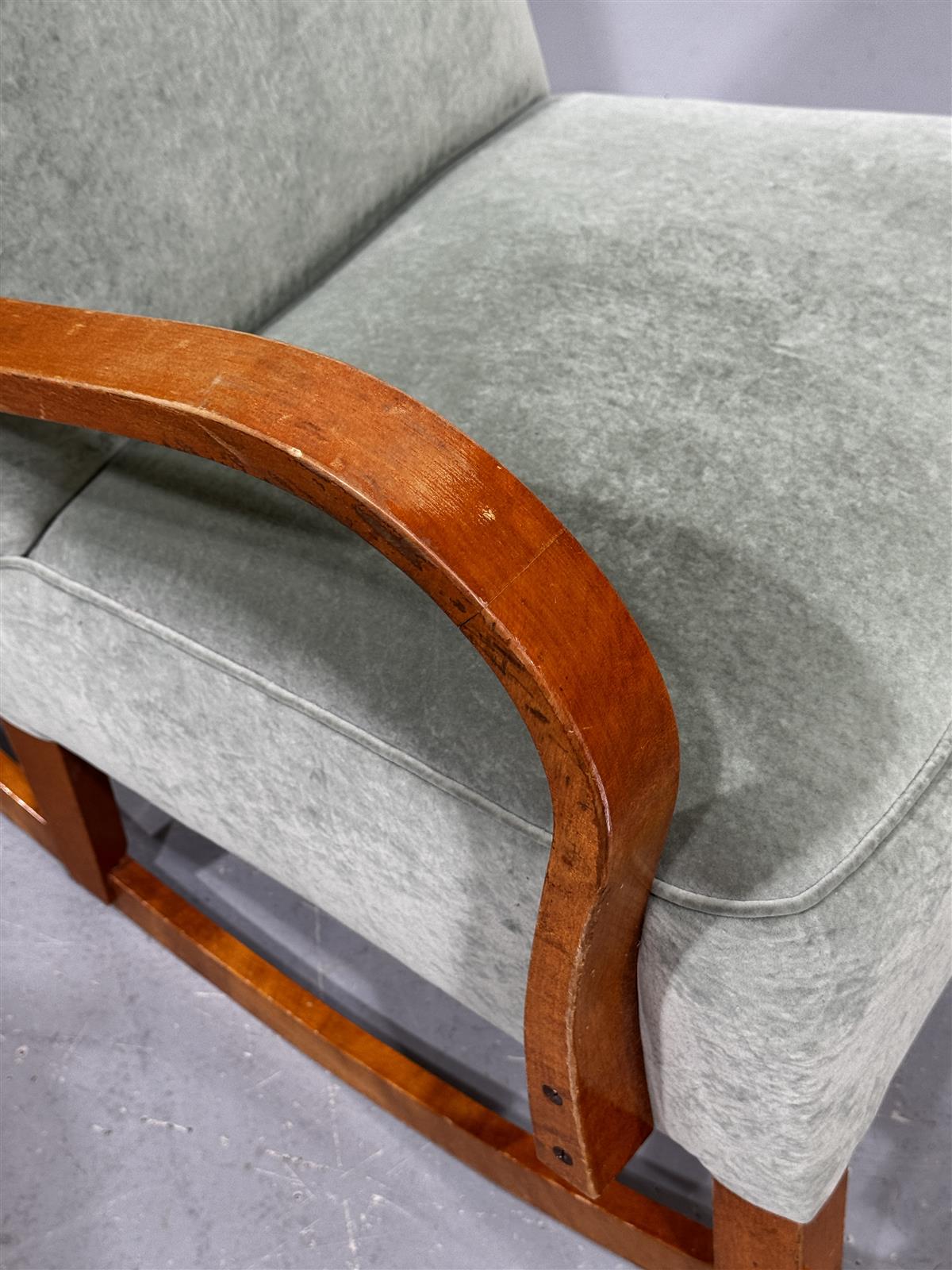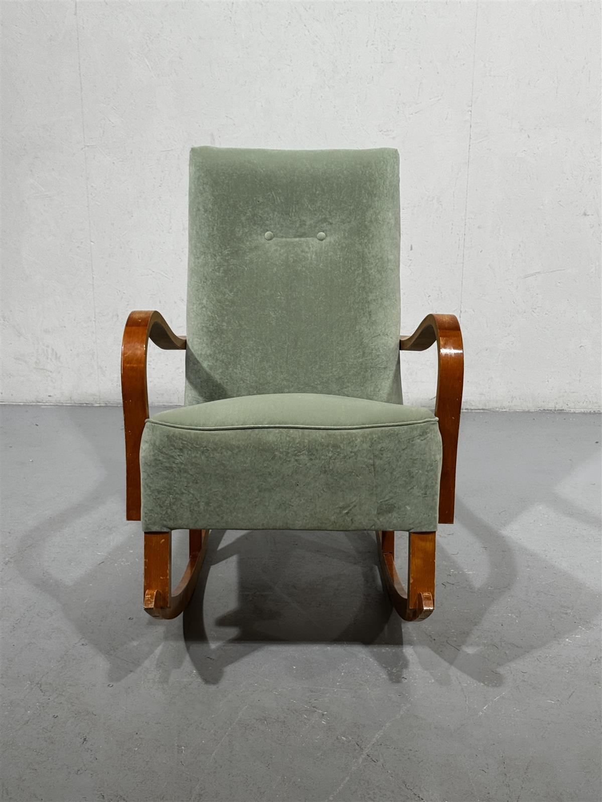 Vihreä kangasverhoiltu keinutuoli, jossa on kauniisti kaarevat puukäsinojat. Tuolissa on korkea selkänoja ja pehmustettu istuinosa.