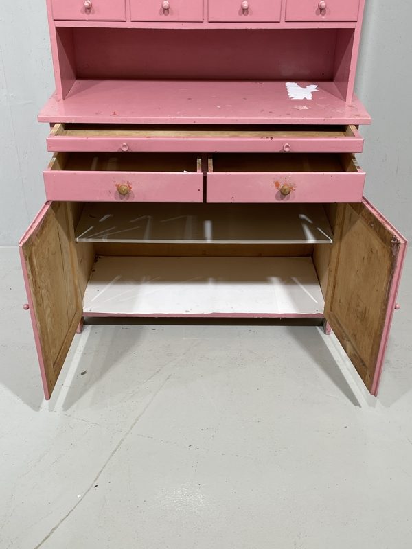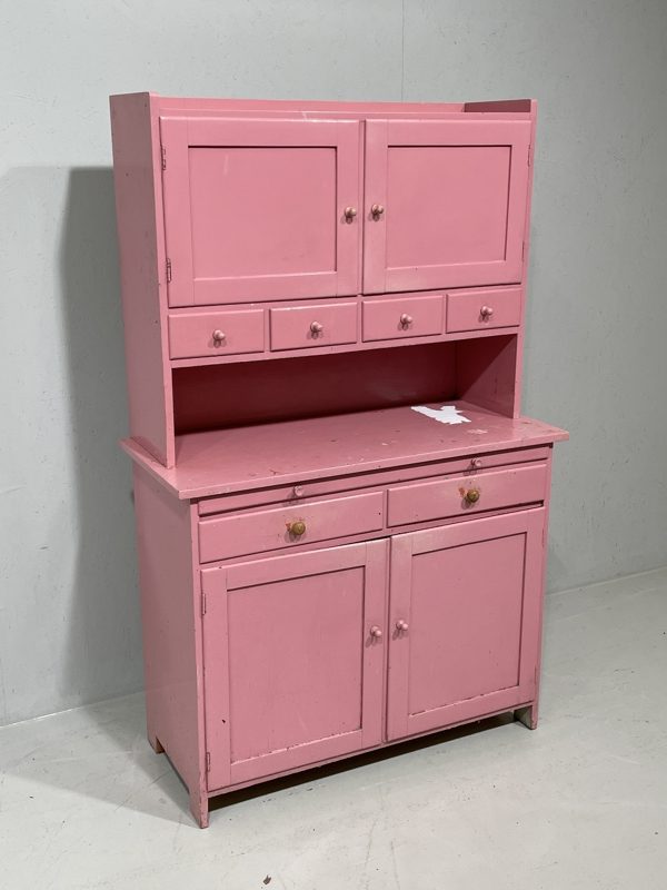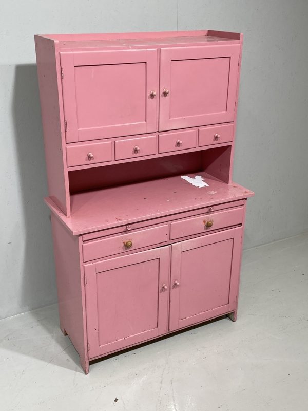 Vintage keittiökaappi. Maalattu jälkikäteen vaaleanpunaiseksi, kulunut. Yläosassa kaappi ja pieniä lokerikoita, alla kaappi sekä vetolaatikoita ja ulosvedettävä taso. yksiosainen. Sopiva projekti pintaehostajalle.