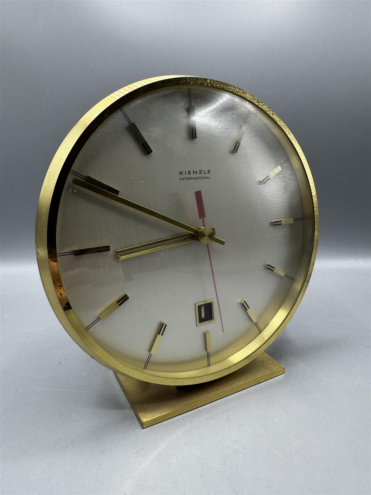 Kienzle International Everdate pöytäkello design Heinrich Möller, jossa on kultainen kehys ja selkeä kellotaulu. Kellossa on punainen sekuntiviisari ja päivämääränäyttö.