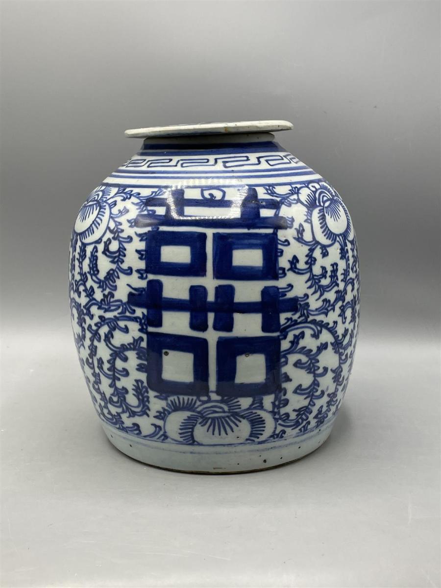Sinivalkoinen käsinmaalattu posliini ruukku, jossa on perinteisiä kiinalaisia kuvioita. Ruukku on varustettu irrotettavalla kannella.