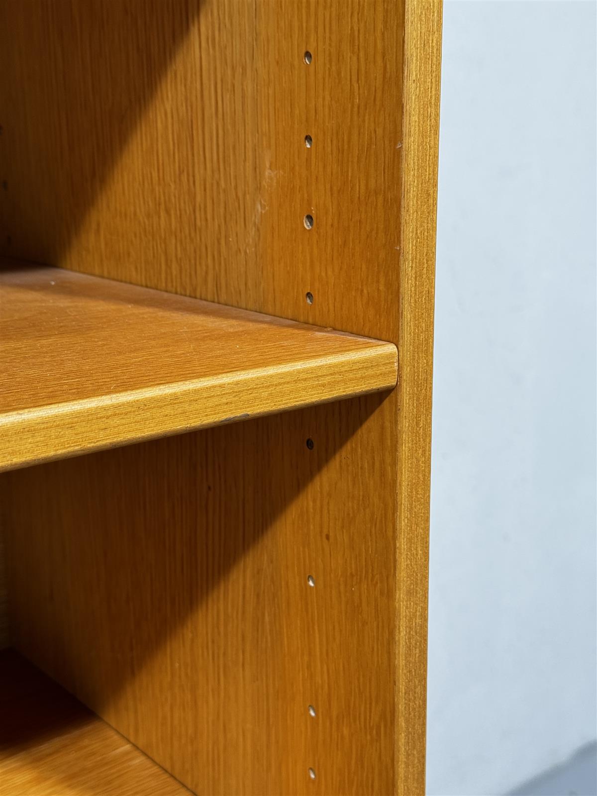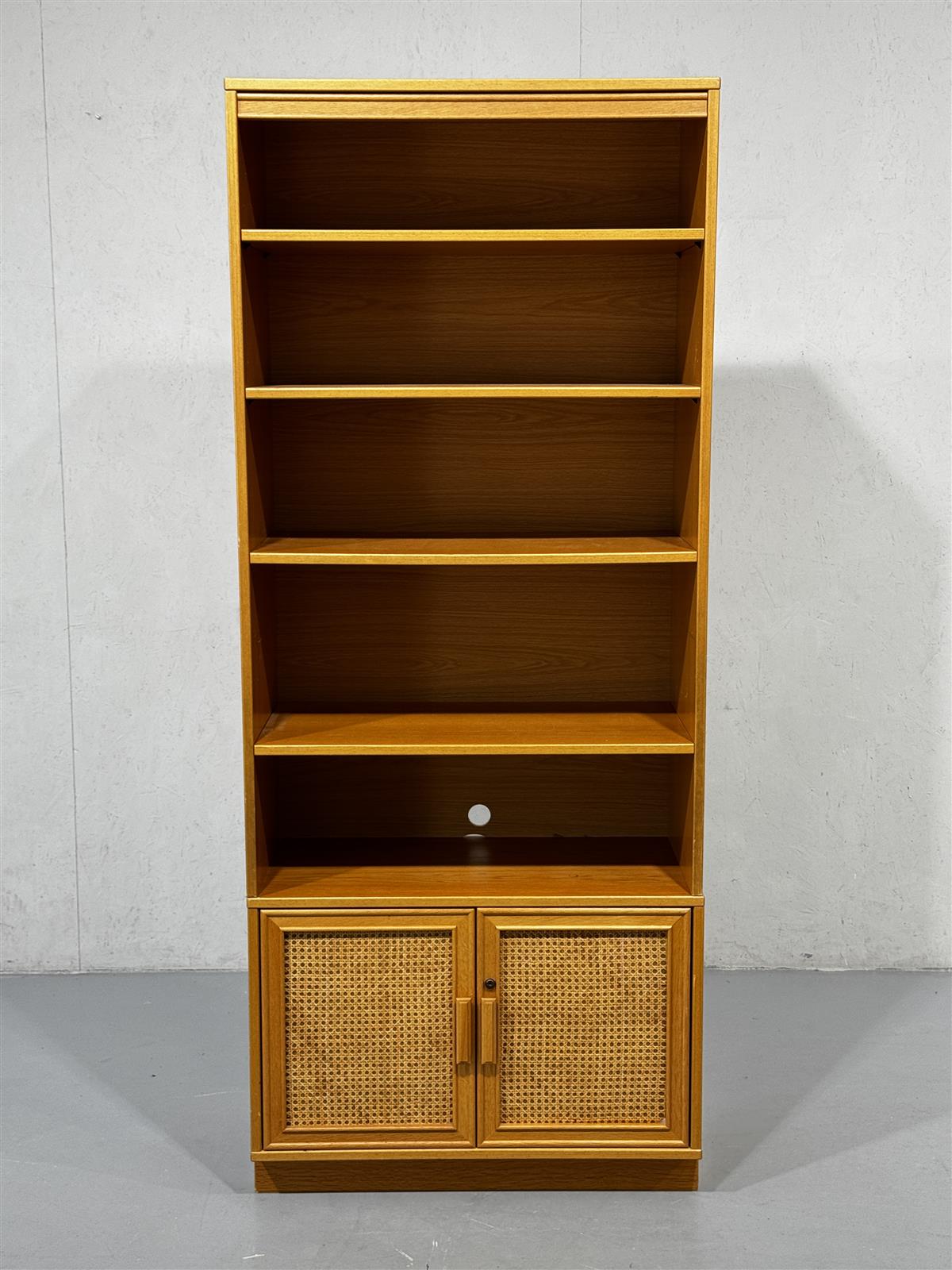 Tukeva korkea kirjahylly, jossa on useita hyllytasoa ja alaosassa kaapit rottinkiyksityiskohdilla. Kaksiosainen, siistikuntoinen ja laadukkaasti valmistettu.Hyllyssä on myös takaseinässä reikä johtojen läpivientiä varten.