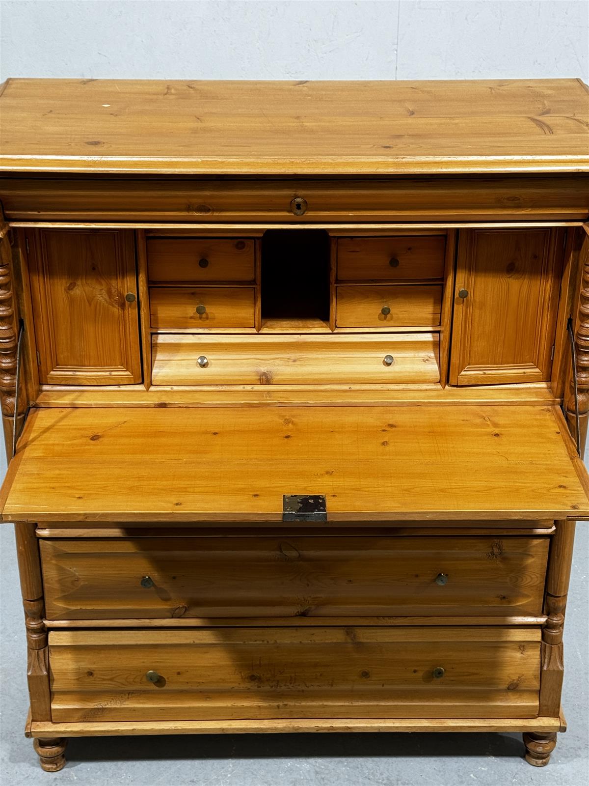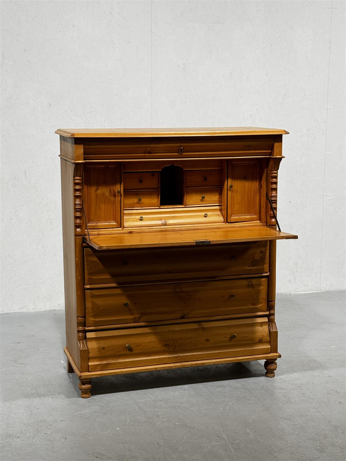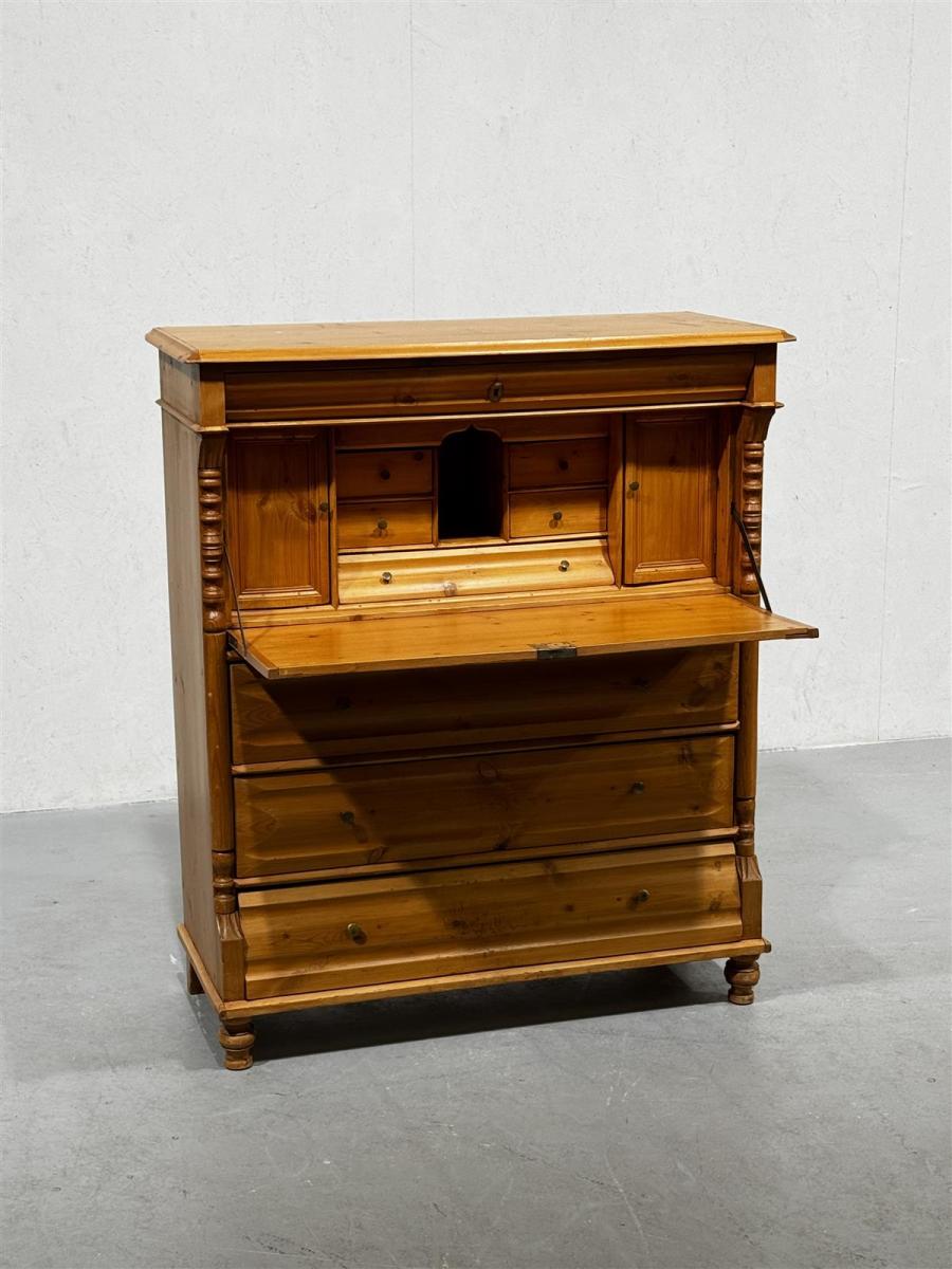 Ihana vanha kirjoituslipasto, jossa on useita laatikoita ja kaappeja. Kääntyvä kirjoitustaso, jossa lukko ja mukana avain, joka sopii lukkoon.