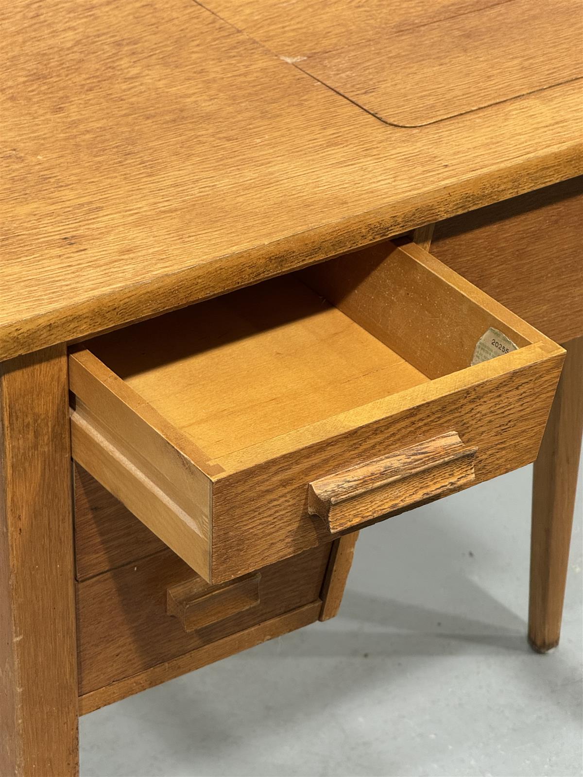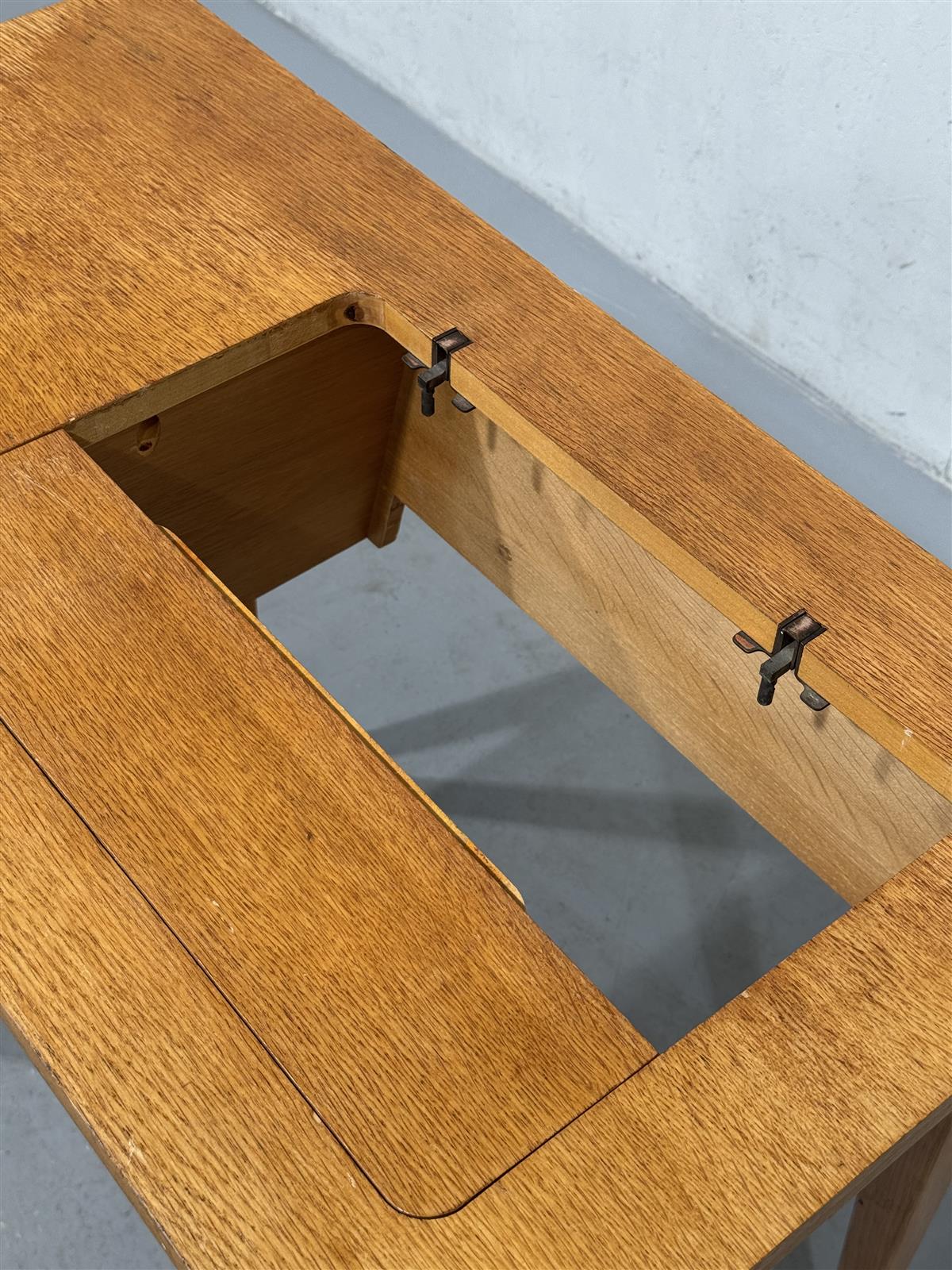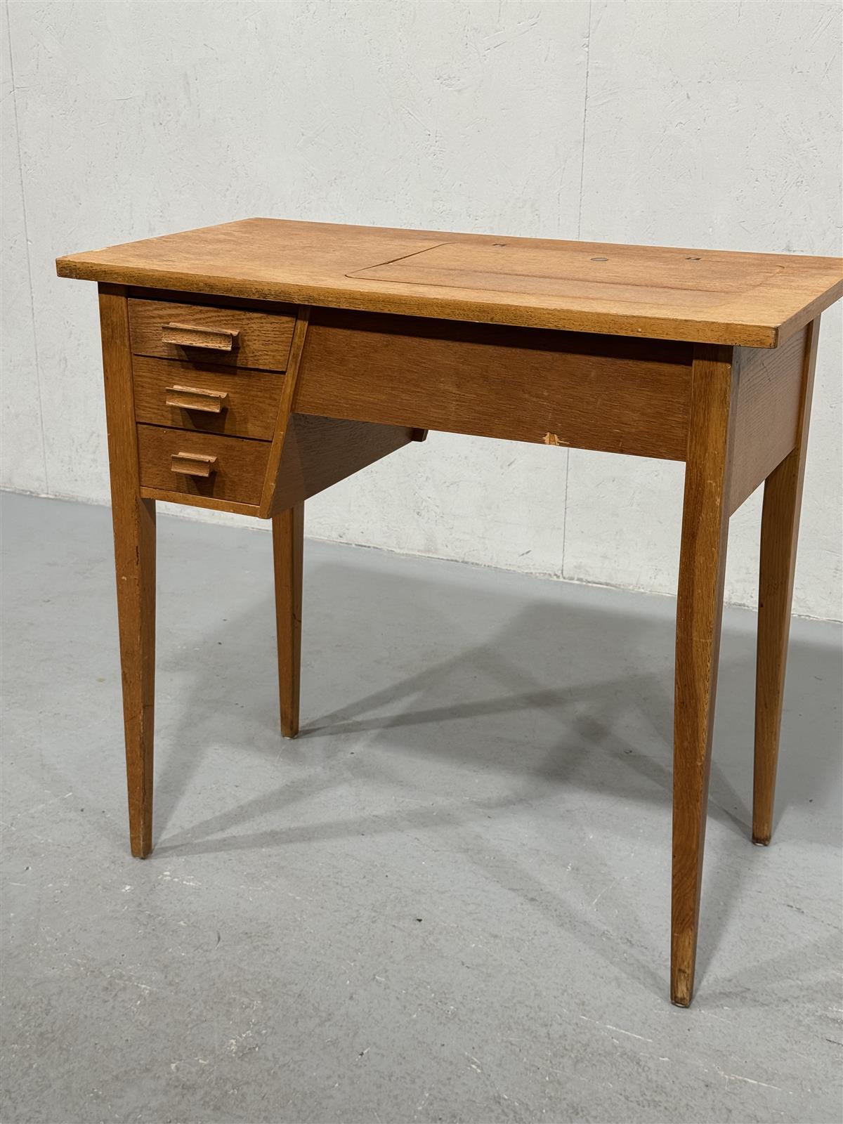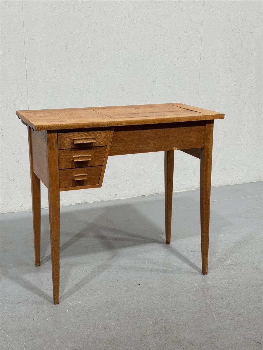 Kirjoituspöytä, jossa on kolme vetolaatikkoa vasemmalla puolella. Pöydän kannessa on avattava luukku, jossa on joskus ollut ompelukone. Pöydässä on näkyvissä kulumisen jälkiä, kuten naarmuja ja pieniä kolhuja, mutta se on yleisesti ottaen hyvässä kunnossa.