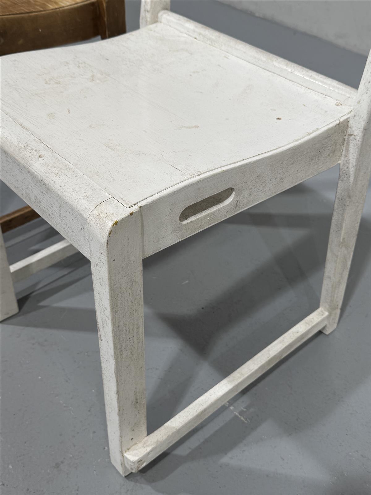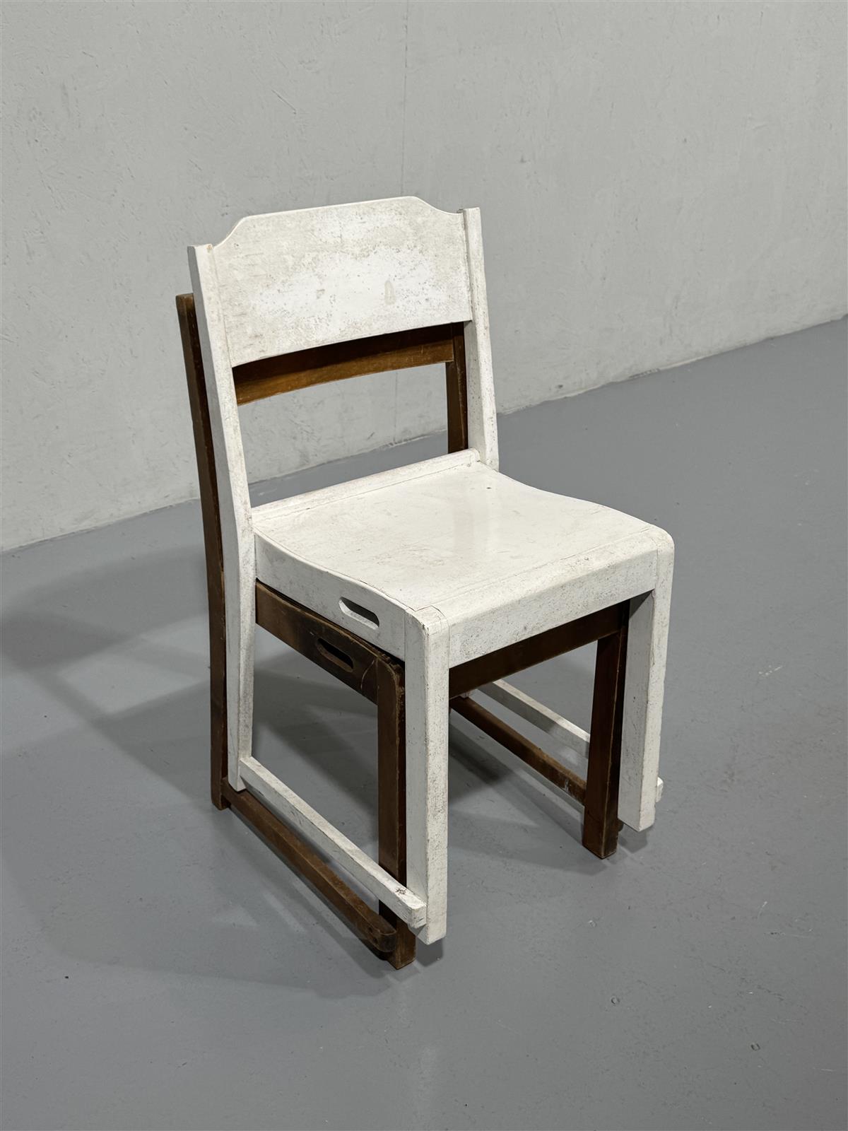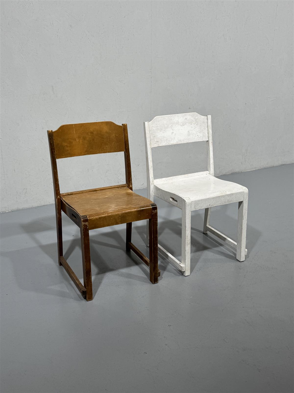 Kaksi vintage-tuolia 60-luvulta, valmistettu puusta. Toinen tuoli on ruskea ja toinen valkoinen, mikä tuo mukavaa kontrastia sisustukseen. Tuolit ovat yksinkertaisia ja toimivia, sopien monenlaisiin tiloihin. Valkoinen tuoli on maalattu, kun taas ruskea on säilyttänyt alkuperäisen puupintansa. Pinottavissa, ottimet kyljissä.