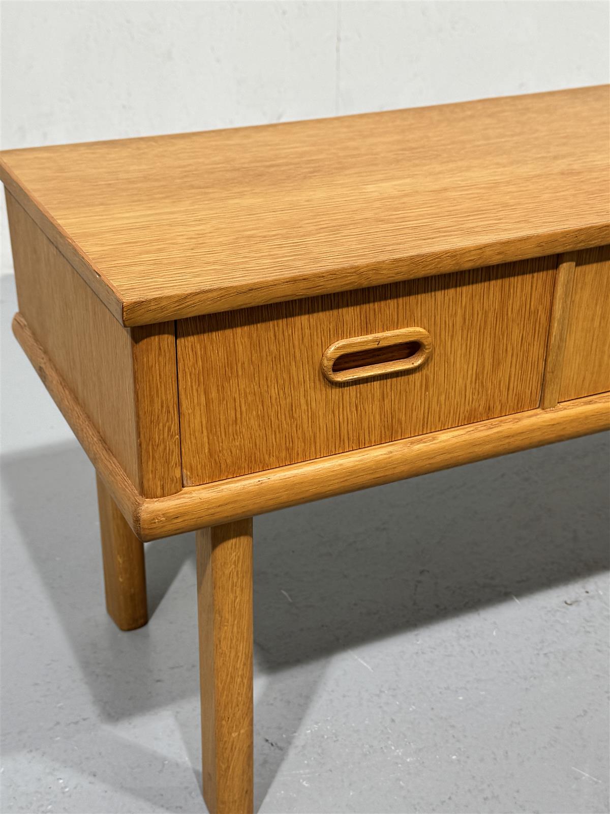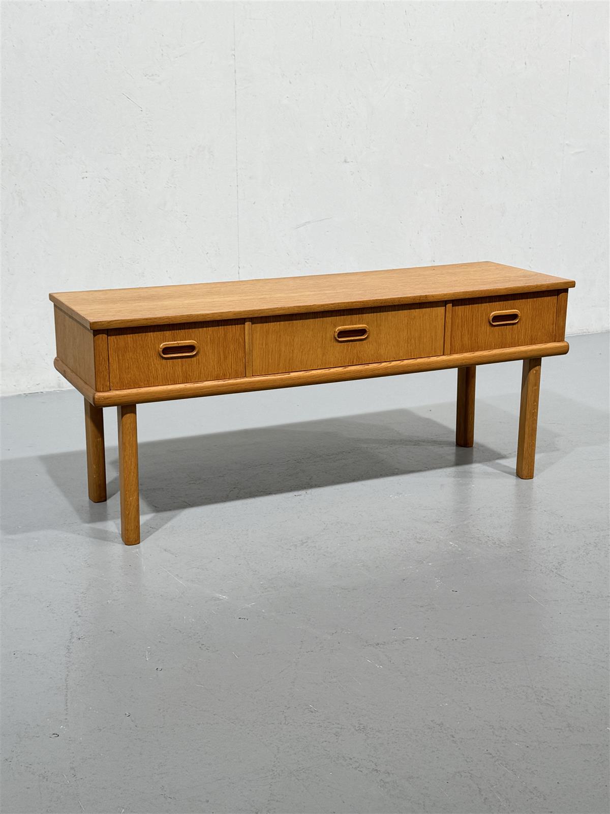 Tyylikäs 60-luvun tammiviilu lipasto, jossa on kolme vetolaatikkoa. Valmistajaa ei tiedetä, mutta muotoilu on selkeästi aikakaudelle tyypillinen, korostaen käytännöllisyyttä ja yksinkertaisuutta.