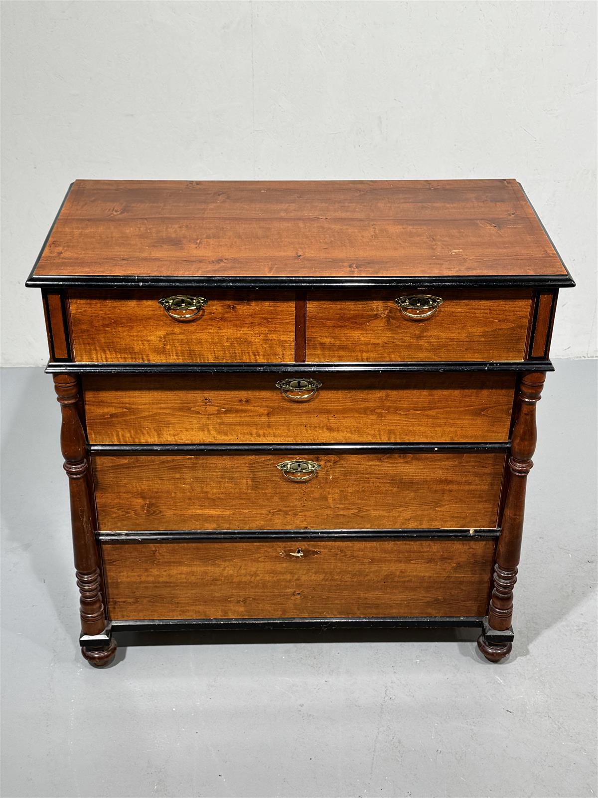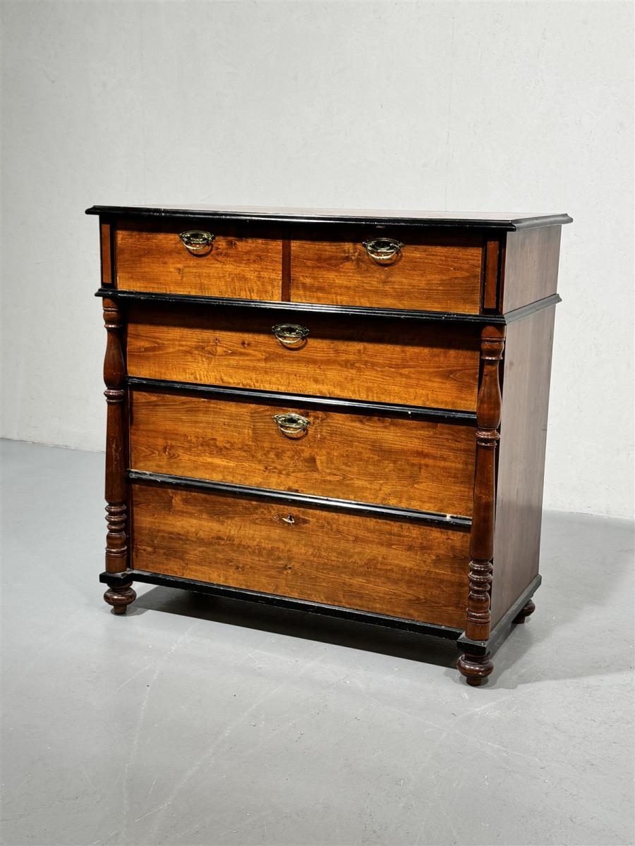 Komea vintage-lipasto, jossa on viisi vetolaatikkoa ja koristeelliset messinkivetimet. Eesine huokuu vanhan ajan käsityötaitoa ja arvokkuutta.