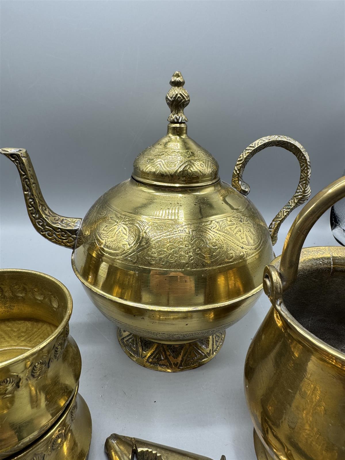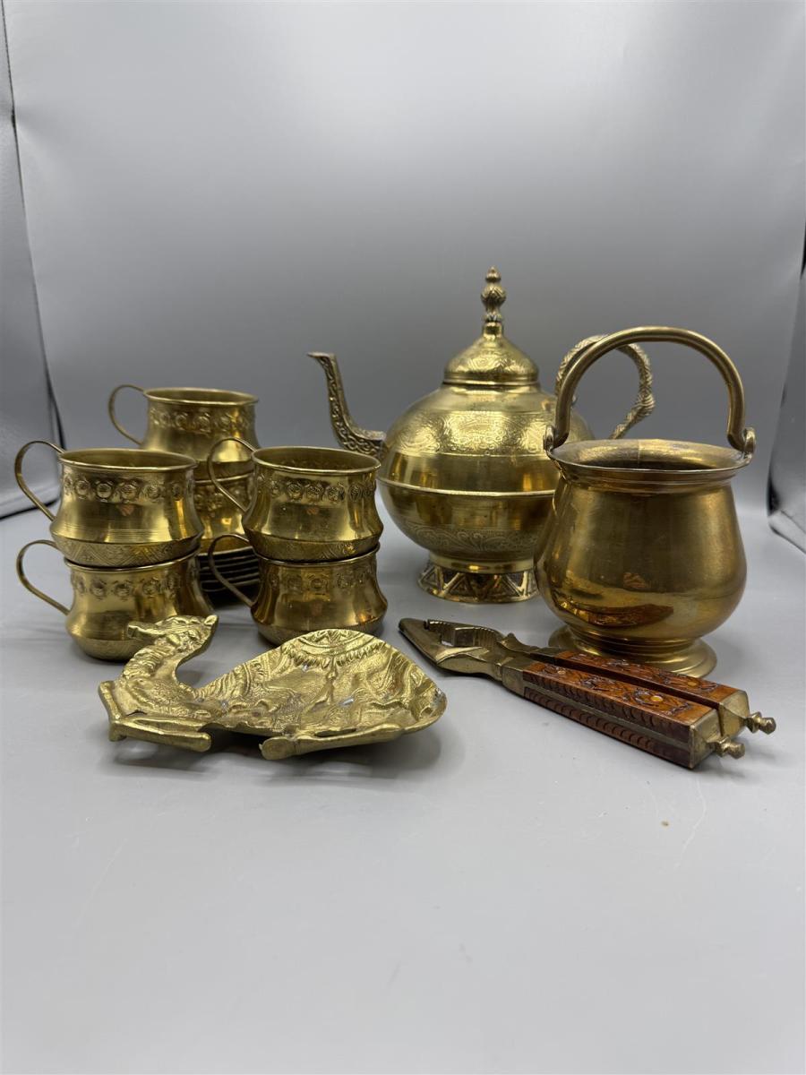 Tyylikäs vintage messinkinen teekannu ja kuusi kuppia aluslautasille. Teekannussa on kauniit kaiverrukset ja samoin aluslautasissa ja kupeissa. Mukana myös kahvallinen kannu, pähkinänsärkijä sekä kameli teepussi lautanen.