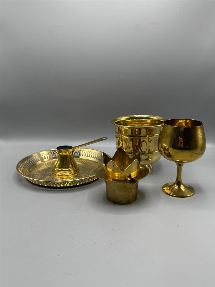 Tyylikäs kokoelma vintage-messinkisiä koriste-esineitä, jotka sisältävät tarjottimen, kynttilänjalan, maljan, tuhkakupin ja pikarin. Näissä esineissä on kauniit yksityiskohdat ja ne tuovat esille messingin lämpimän sävyn.
