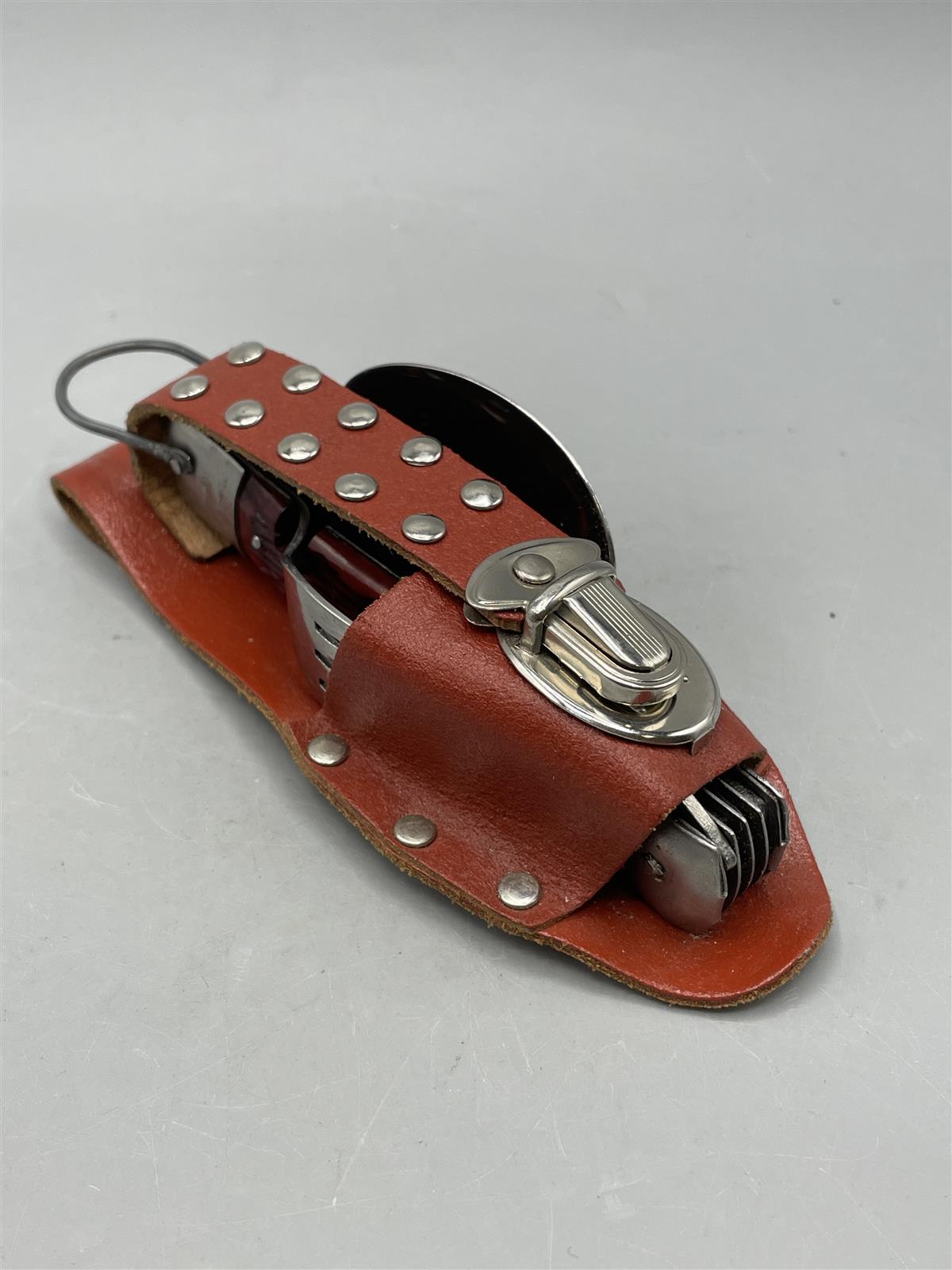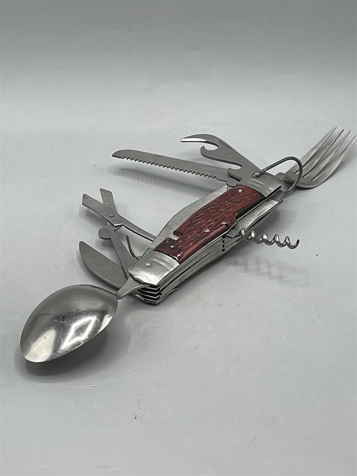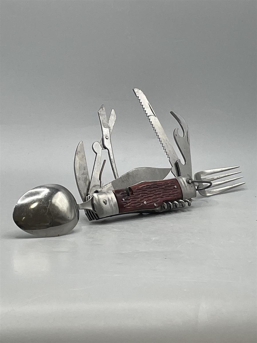 Monipuolinen monitoimityökalu, jossa on useita eri toimintoja kuten veitsi, sakset, saha, korkkiruuvi ja pullonavaaja. Mukana myös lusikka ja haarukka. Vyökiinnitys nahkakotelossa.