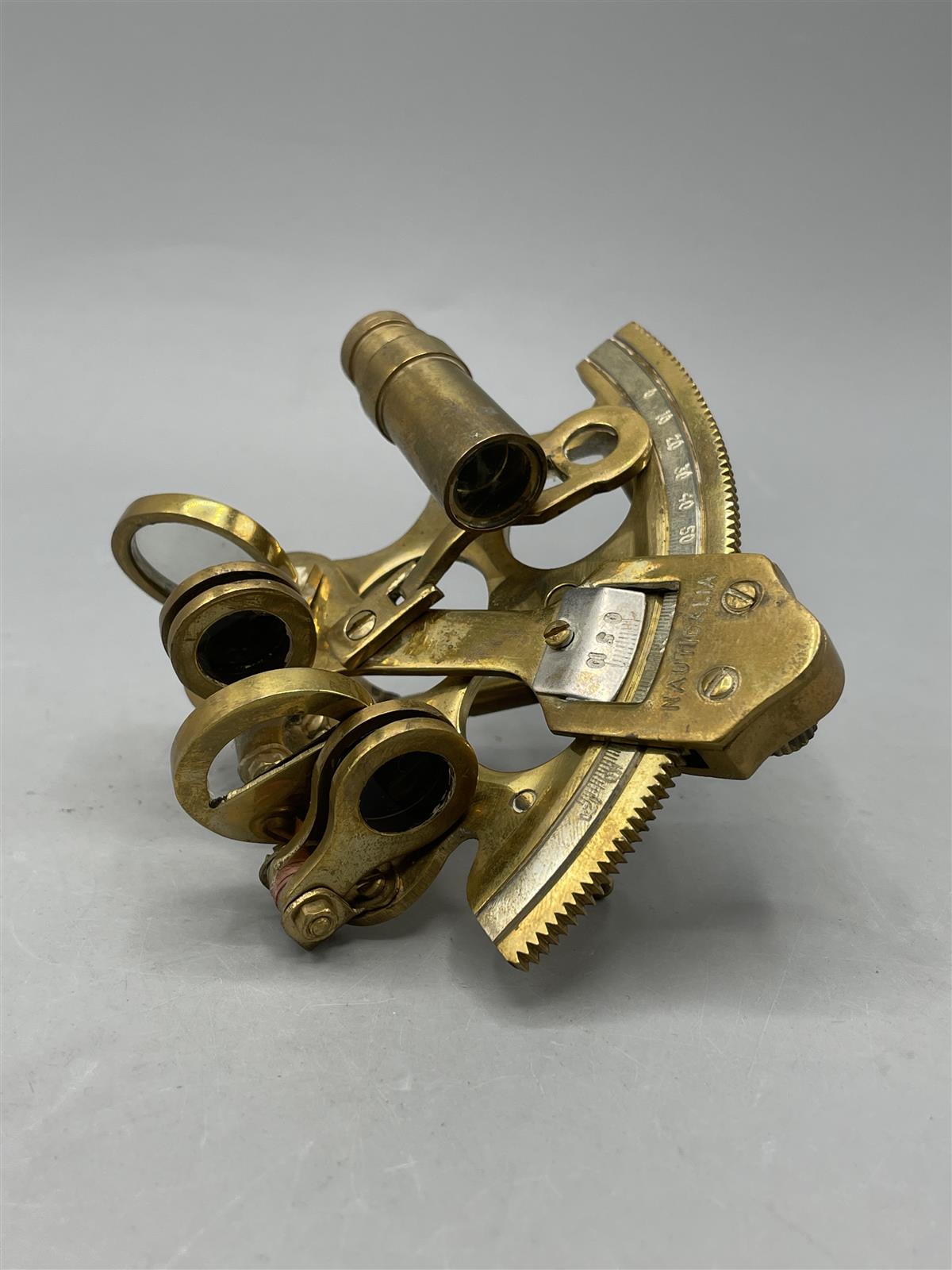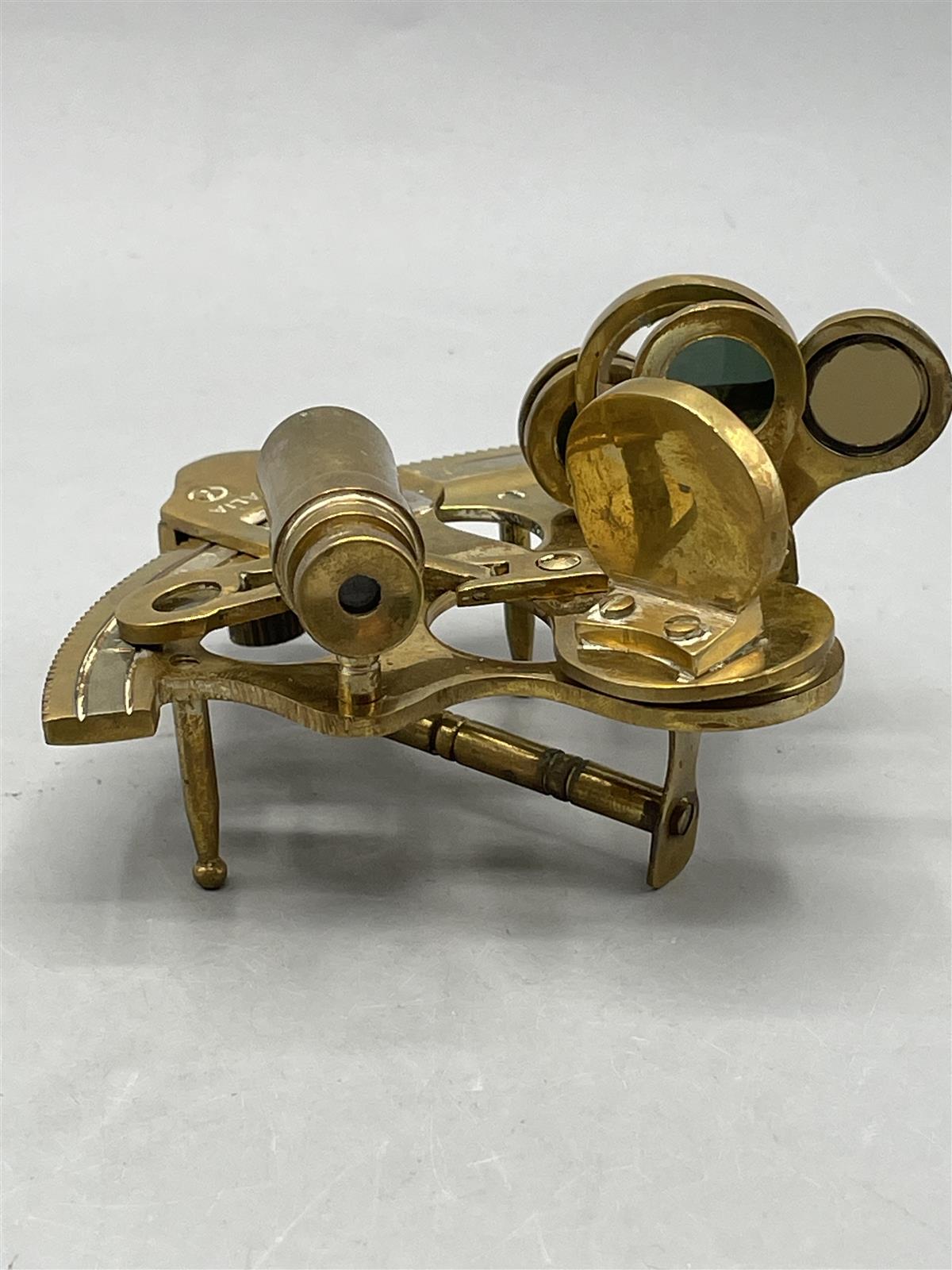 Kompakti messinkinen sekstantti, joka on suunniteltu kulmien mittaamiseen merenkulussa. Tämä instrumentti on valmistettu kestävästä messingistä ja siinä on tarkat asteikot ja linssit, jotka mahdollistavat tarkan navigoinnin. Mukana tulee puinen säilytyslaatikko.