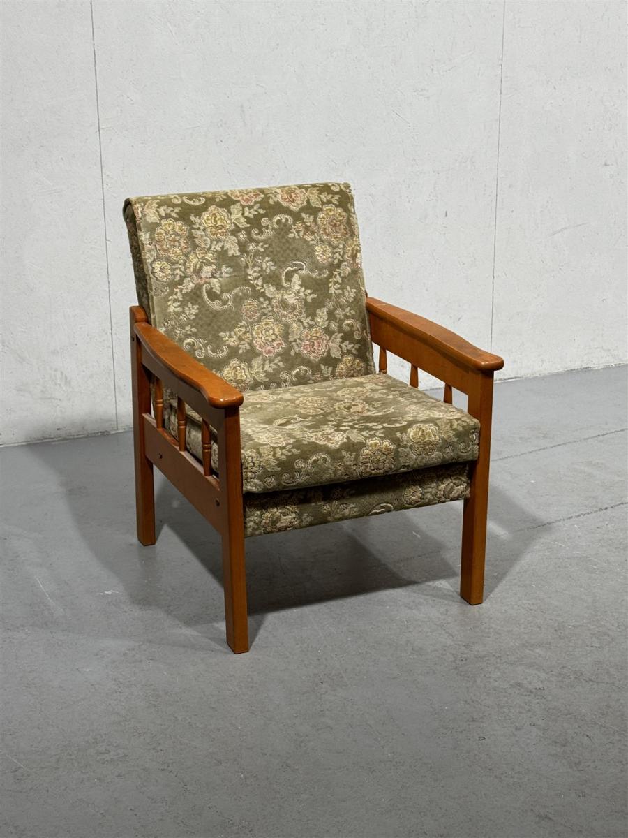 Nojatuolissa on kukkakuvioinen verhoilu ja kevyt puurunko. Tuolin käsinojat ovat puuta ja istuinosa on pehmustettu.