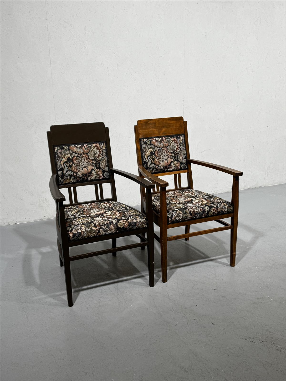 Tyylikkäät 60-luvun nojatuolit, joissa on puurunko ja monivärinen kukkakuvioinen verhoilu. Näissä tuoleissa on mukavat käsinojat ja tukeva rakenne, joka tarjoaa hyvän istumamukavuuden.
