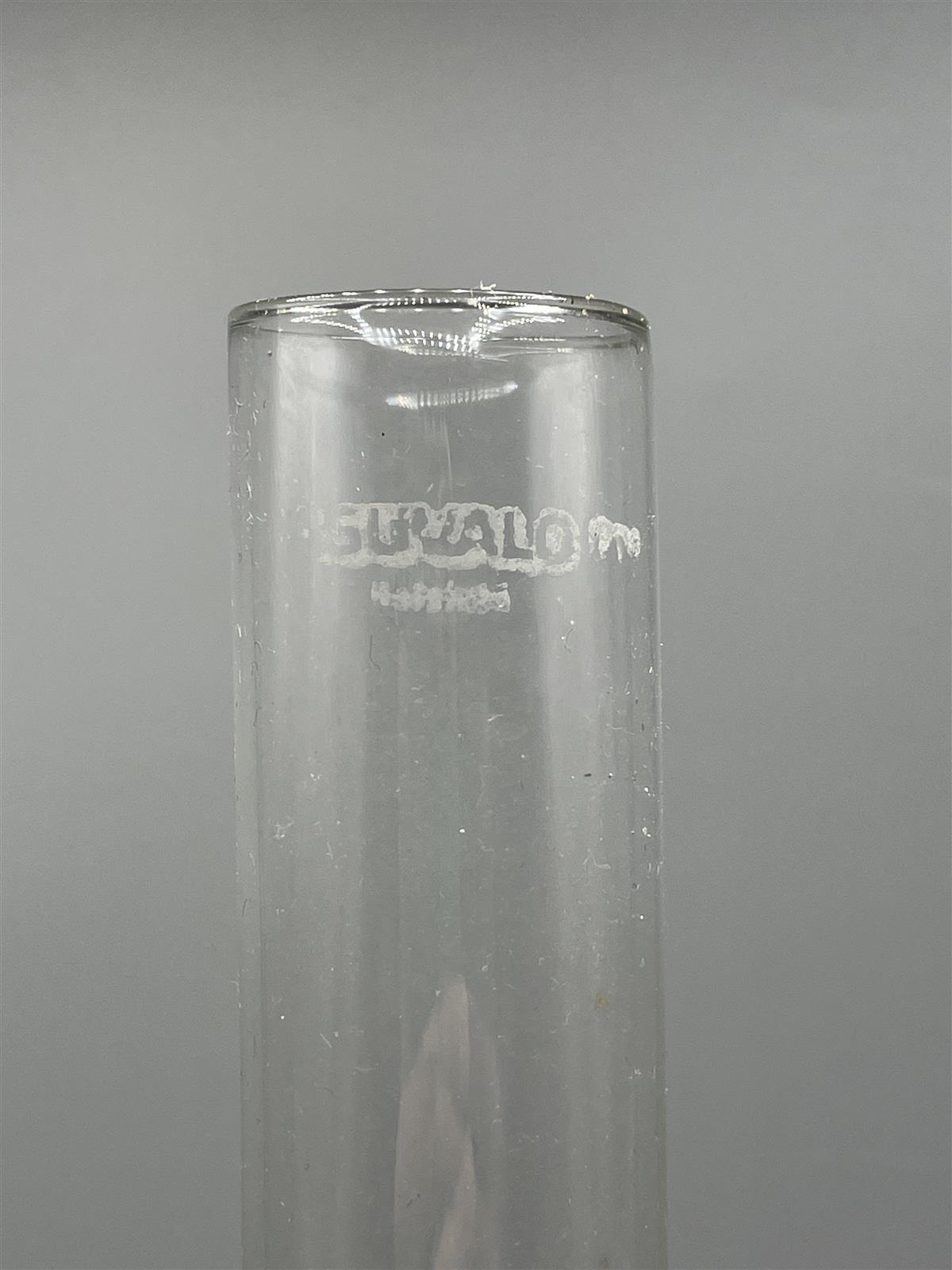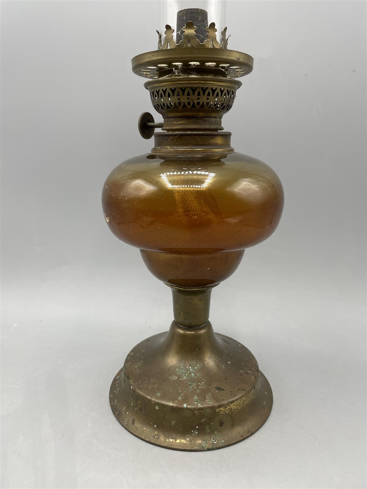 Vintage kotimainen öljylamppu, jossa on lasinen savupiippu ja metallinen jalusta.