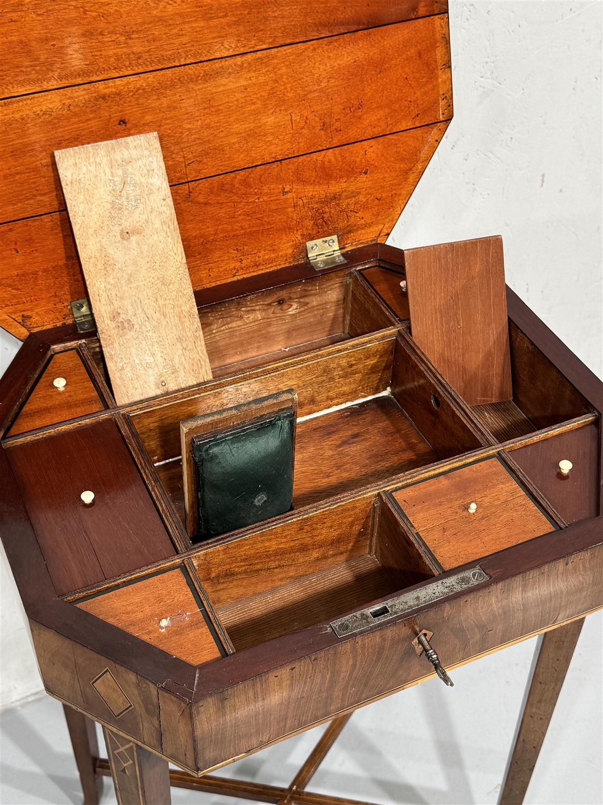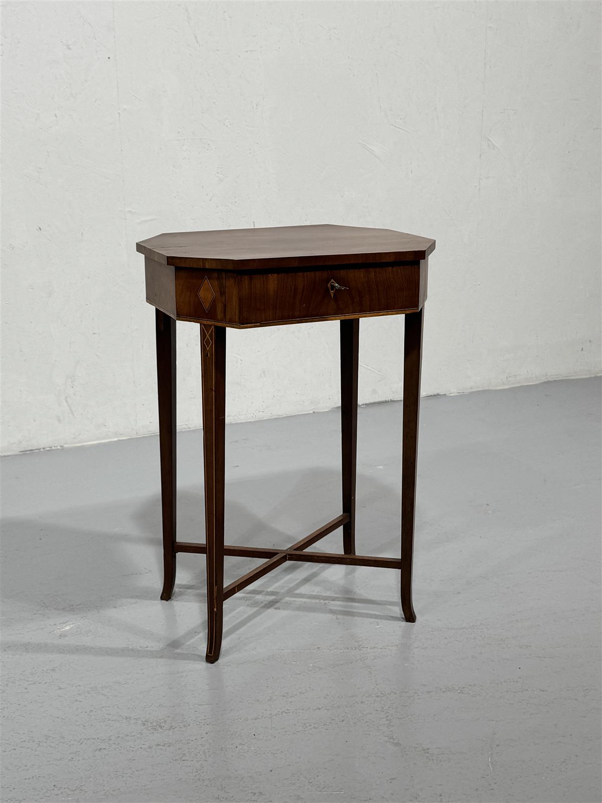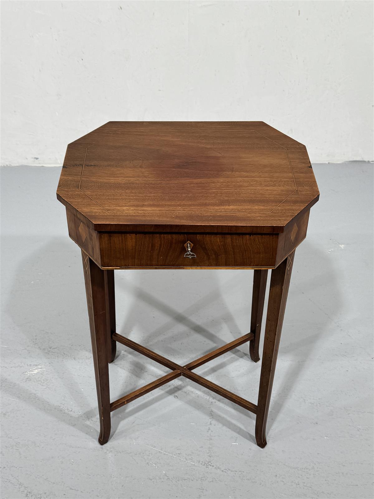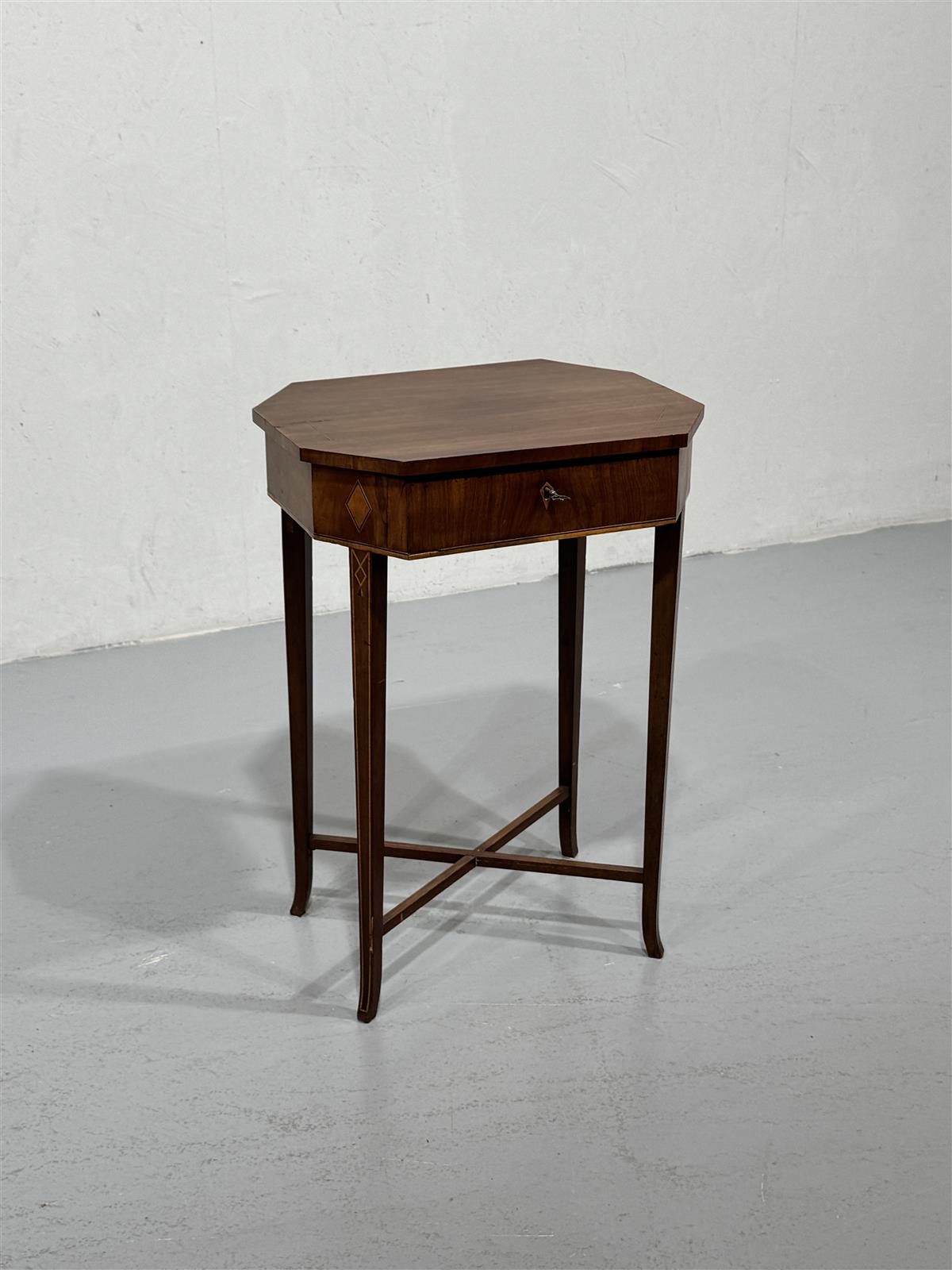 Tyylikäs vintage ompelupöytä, jossa on kahdeksankulmainen muoto ja yksi vetolaatikko. Pöydän sisäpuolella on useita pieniä lokeroita, jotka tarjoavat säilytystilaa pienille esineille. Pöydän jalat ovat suorat ja tukevat, ja ne yhdistyvät ristikkäisellä tukirakenteella.