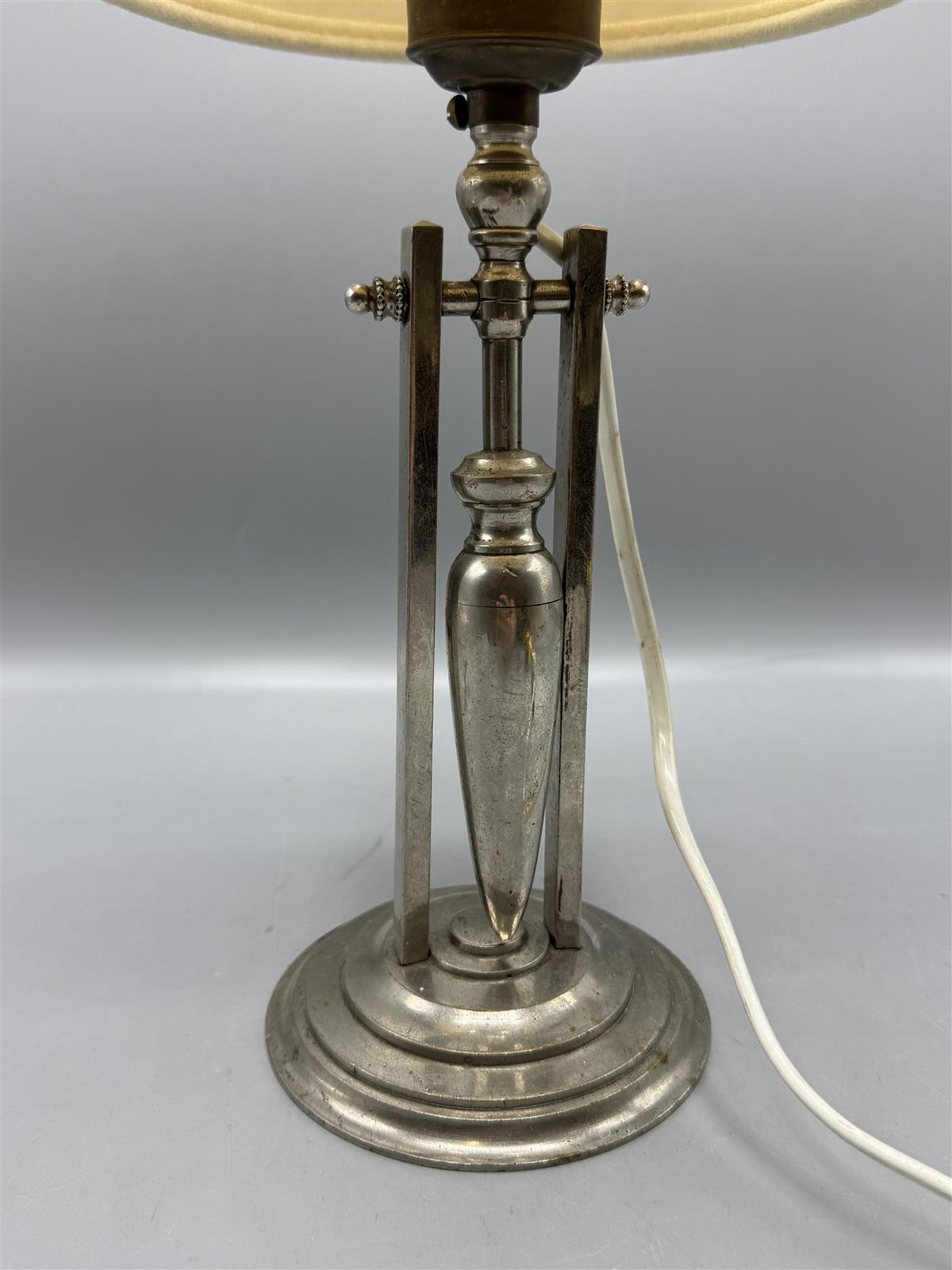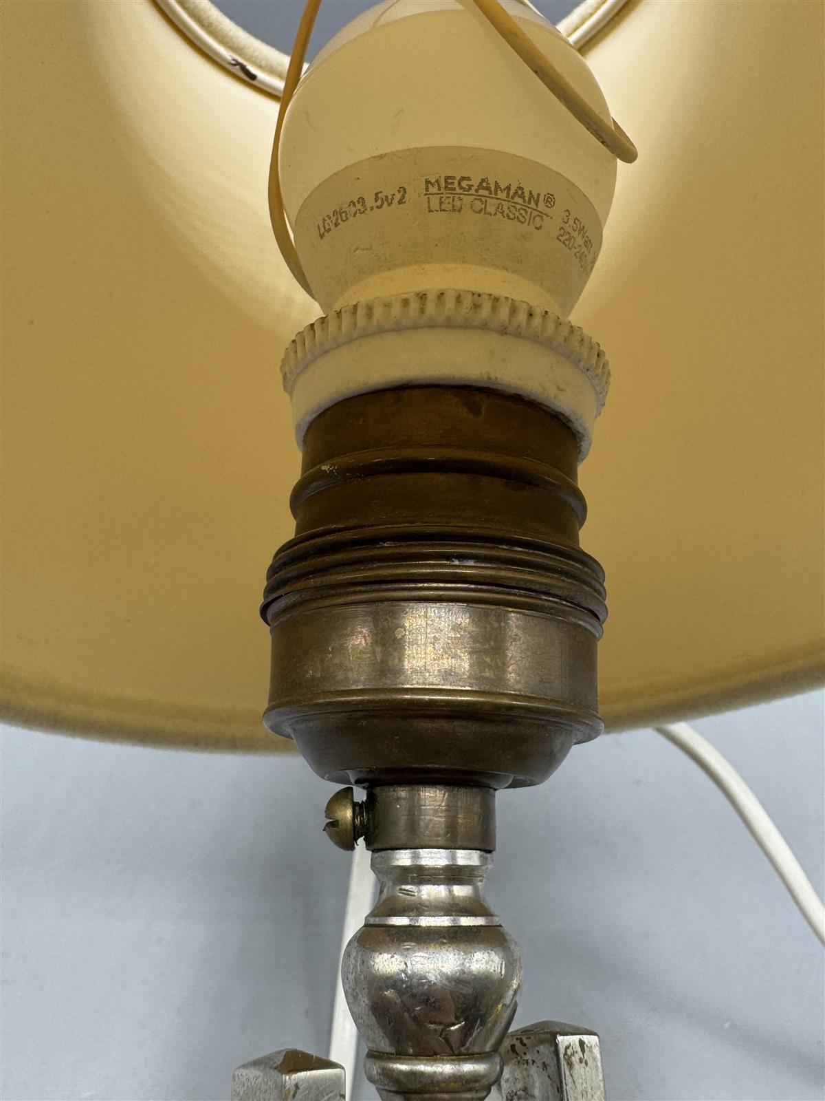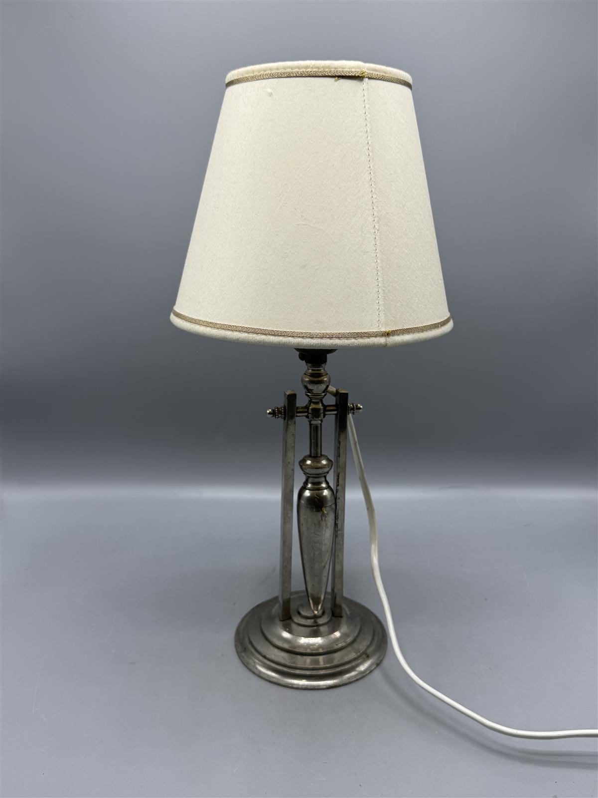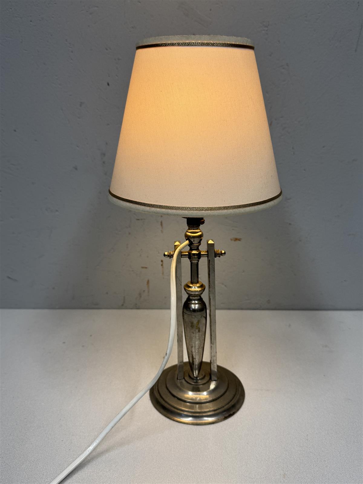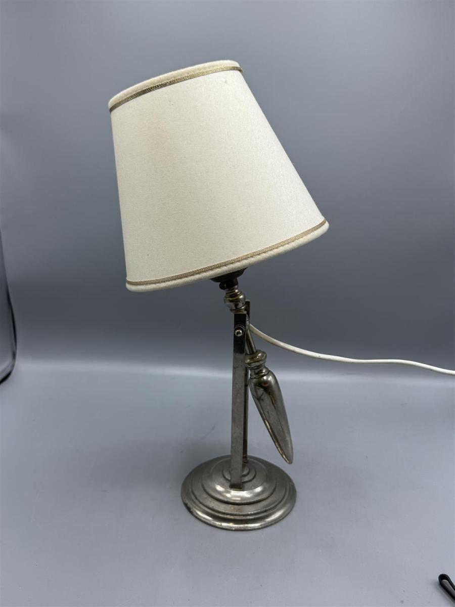 Tyylikäs vintage pöytävalaisin, jossa on metallinen, nivelellä kääntyvä jalka ja vaalea kangasvarjostin. Valaisimen muotoilu on yksinkertainen mutta elegantti, ja se sopii monenlaisiin sisustustyyleihin.