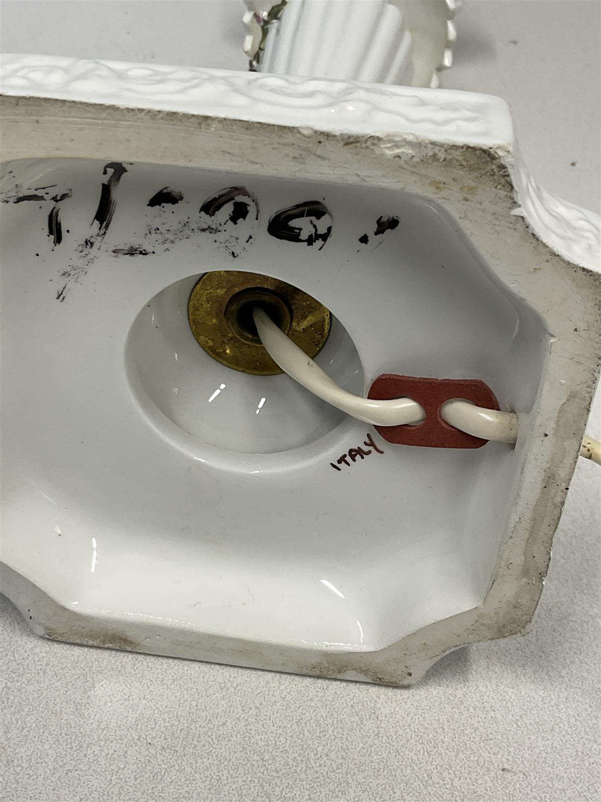 Valaisimen kunto on kohtalainen. Joitakin kulumia ja pieniä naarmuja on havaittavissa, erityisesti johdossa ja pistokkeessa. Posliinissa on pieniä kulumajälkiä, mutta kukkakoristeet ovat ehjät ja hyvin säilyneet.