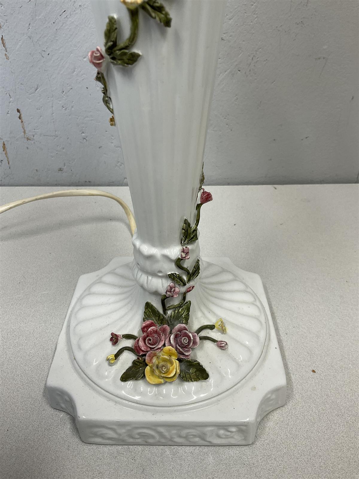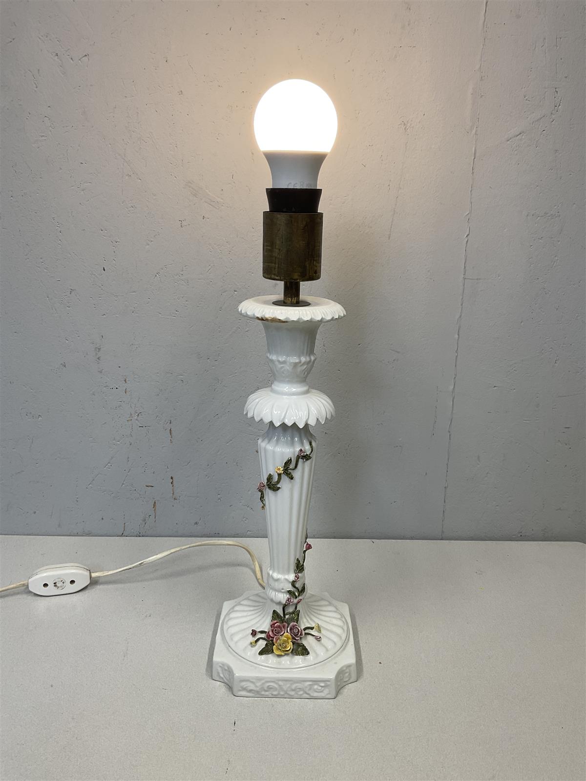 Koristeellinen vintage-pöytävalaisin, jossa on posliininen jalka ja kauniit kukkakoristeet. Valaisin on valmistettu Italiassa ja siinä on klassinen muotoilu.