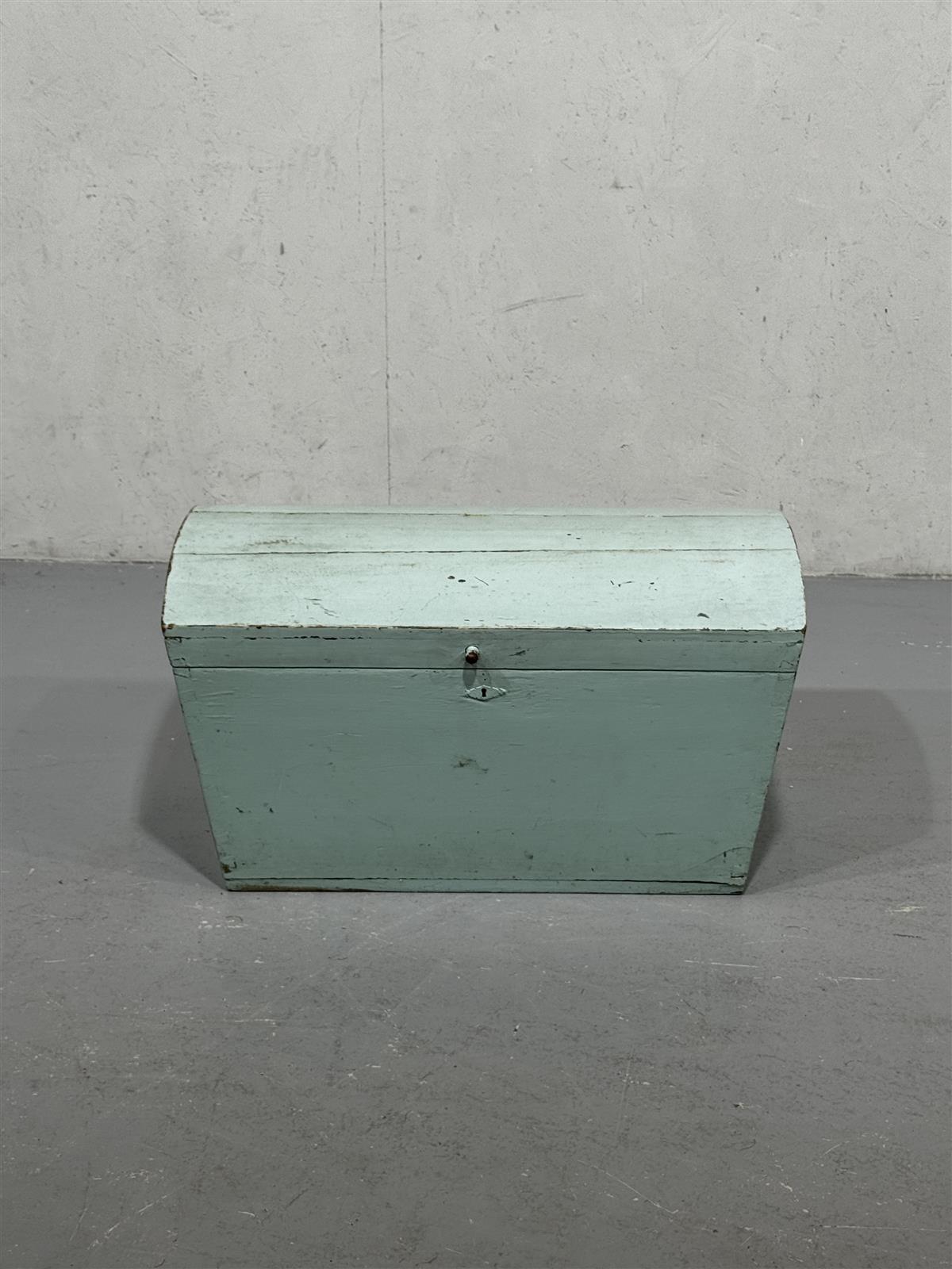 Vihreä arkku, jossa on kaareva kansi ja metallinen lukko. Sisäpuoli on puunvärinen ja siinä on näkyvissä puun syyt.
