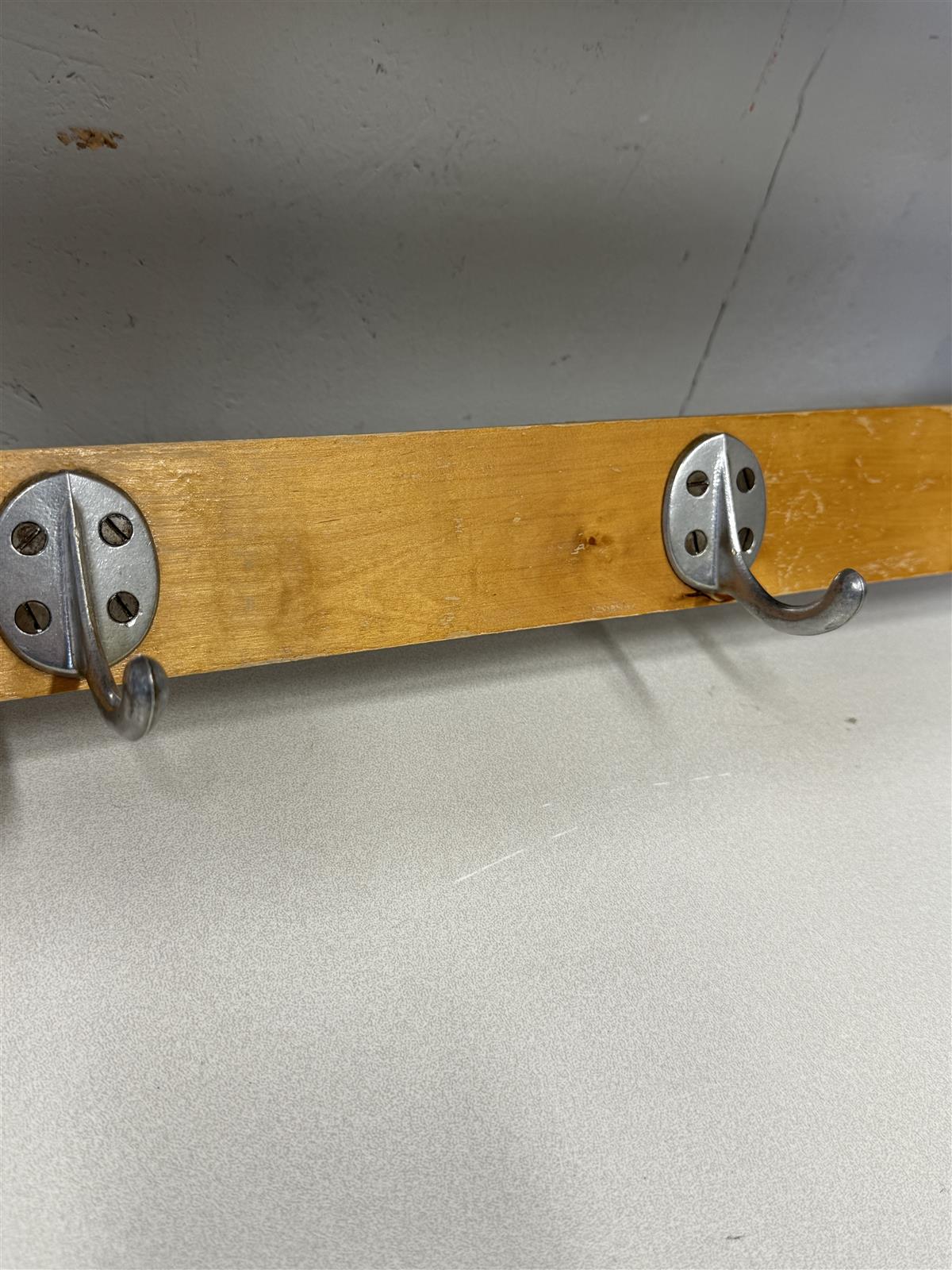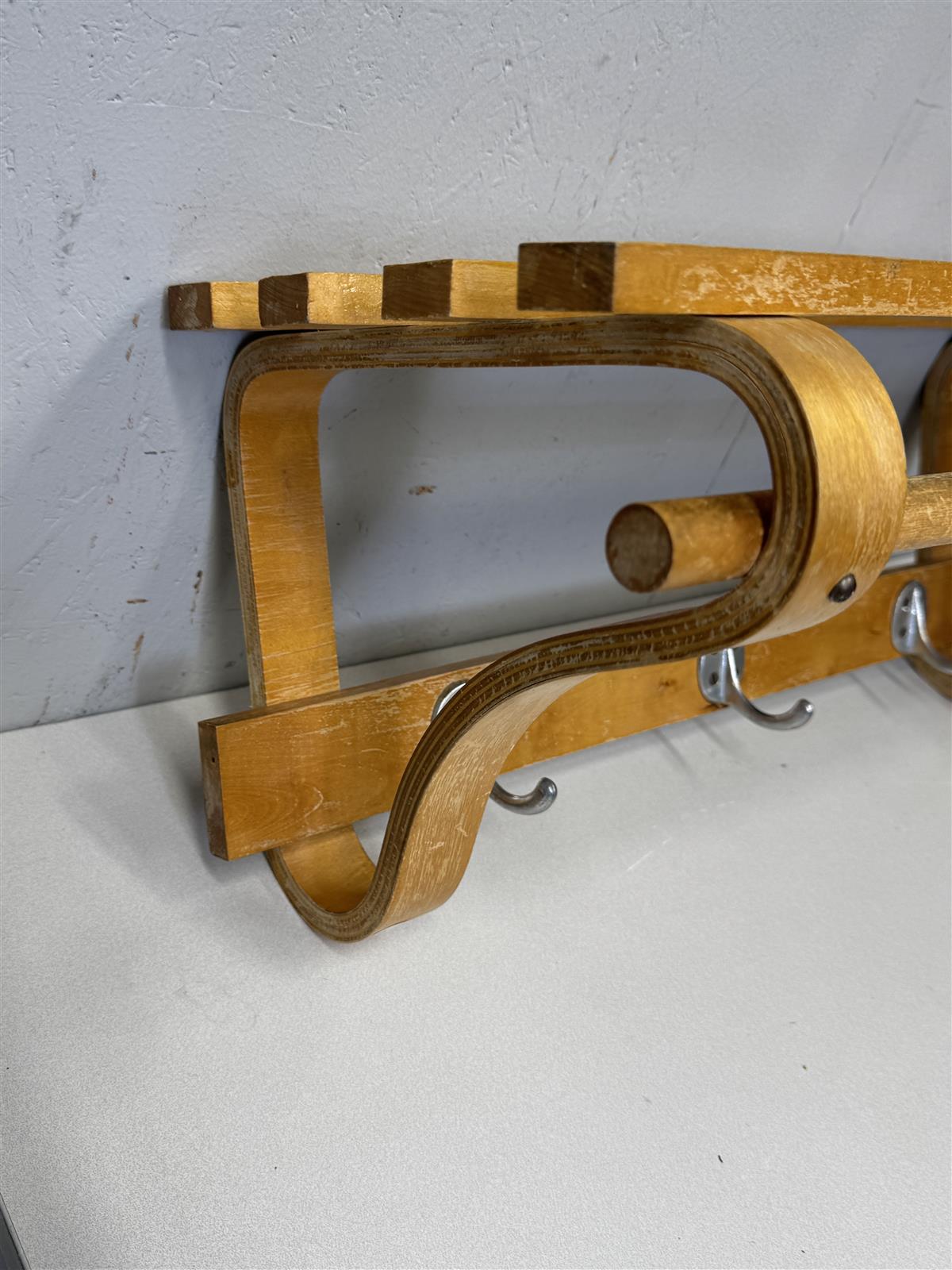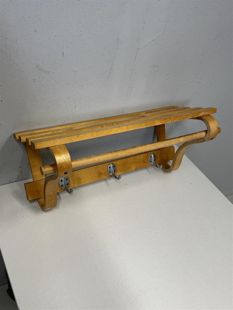 Käytännöllinen puunaulakko, jossa on kolme metallikoukkua ja yläosassa hattuhylly. 60cm leveä, iän tuomaa käytön kulumaa on. Kauniisiti kaartuvat puuosat.