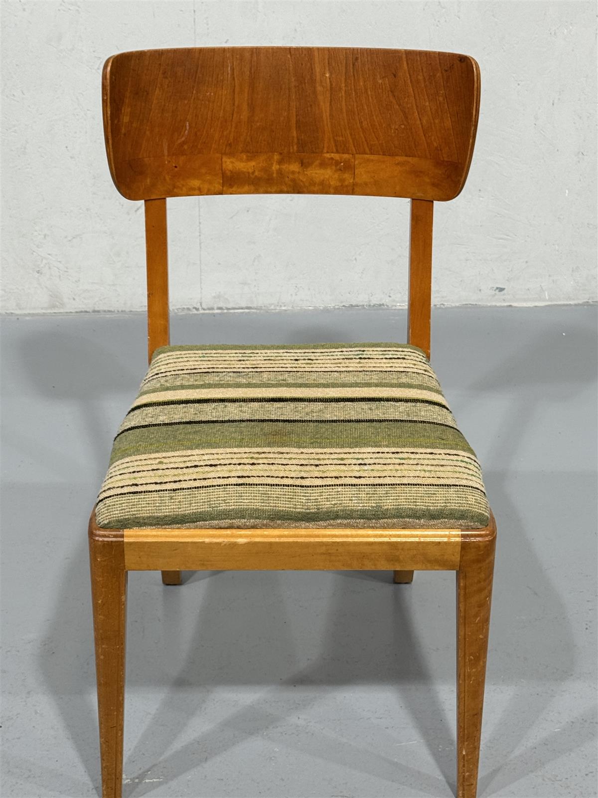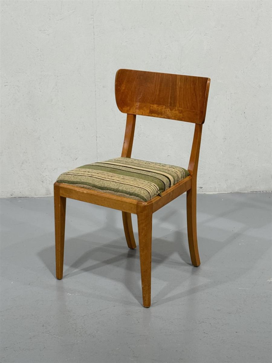 Tyylikäs vintage-puutuoli, jossa on kaareva selkänoja ja raidallinen kangasistuin. Valmistaja ei tiedossa, alkuperämaa oletettavasti Ruotsi. 50-luvun muotoilu tuo esiin aikakauden yksinkertaisen mutta toimivan estetiikan, jossa puun luonnollinen kauneus korostuu. Tuoli on ajan patinoima, ja siinä on näkyviä kulumia ja naarmuja. Kangasistuin on hieman kulunut, mutta edelleen käyttökelpoinen.