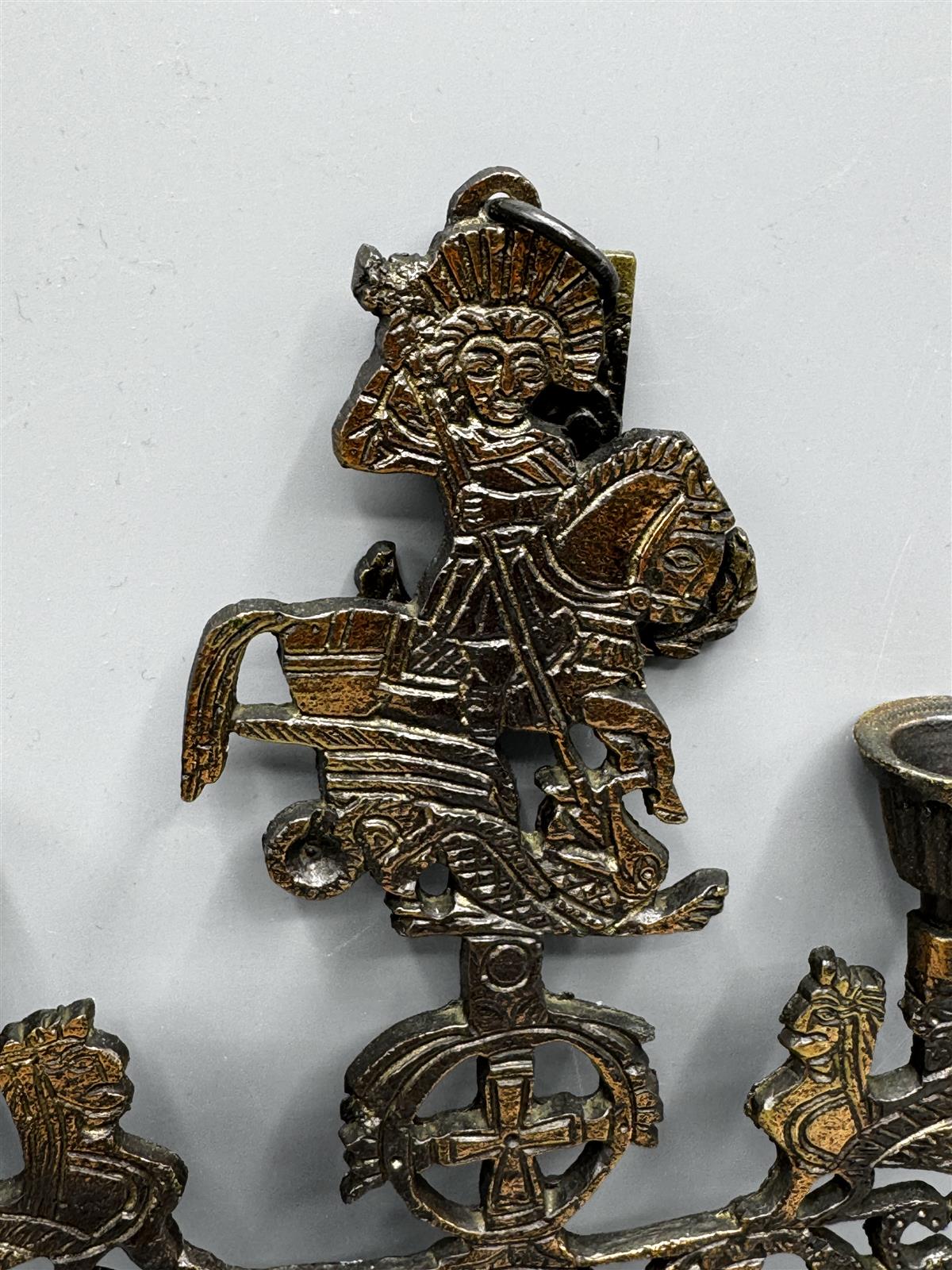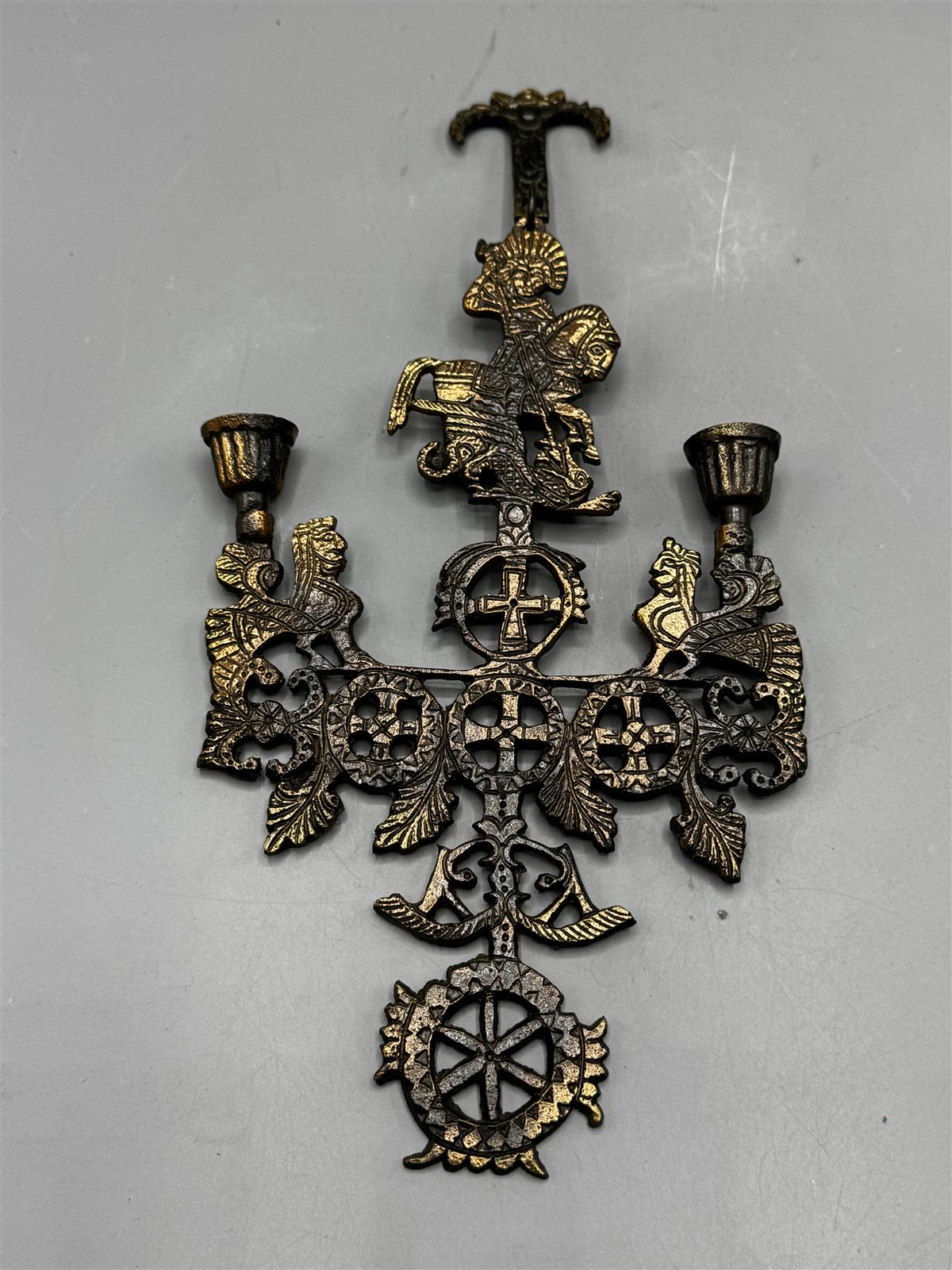 Kynttilänjalka, jossa on koristeellinen ratsastajahahmo ja kaksi kynttiläpidikettä. Kiinnitetään yläosan kiinnikkeestä roikkumaan. Valmistettu metallista ja siinä on yksityiskohtaisia kuvioita.