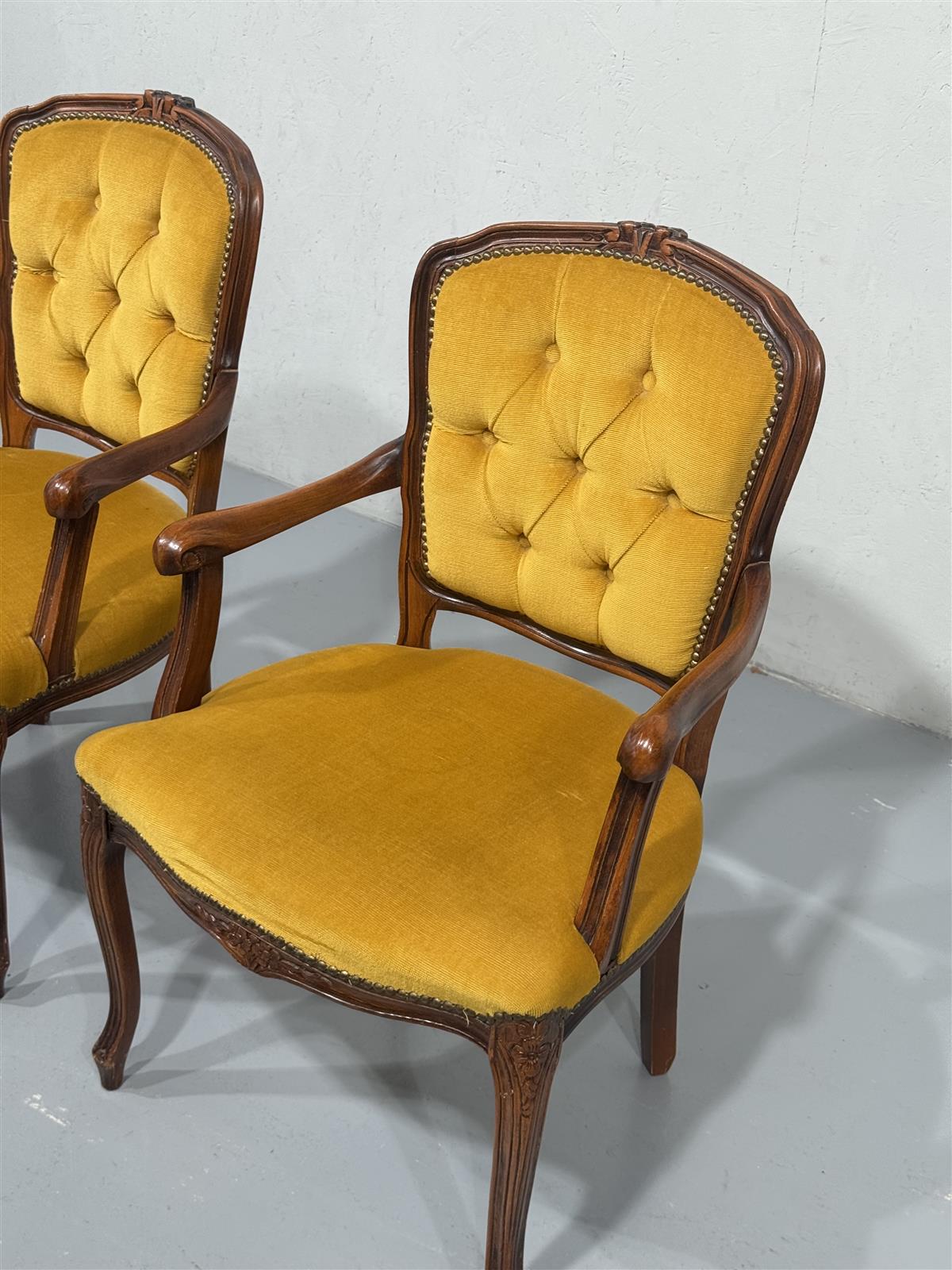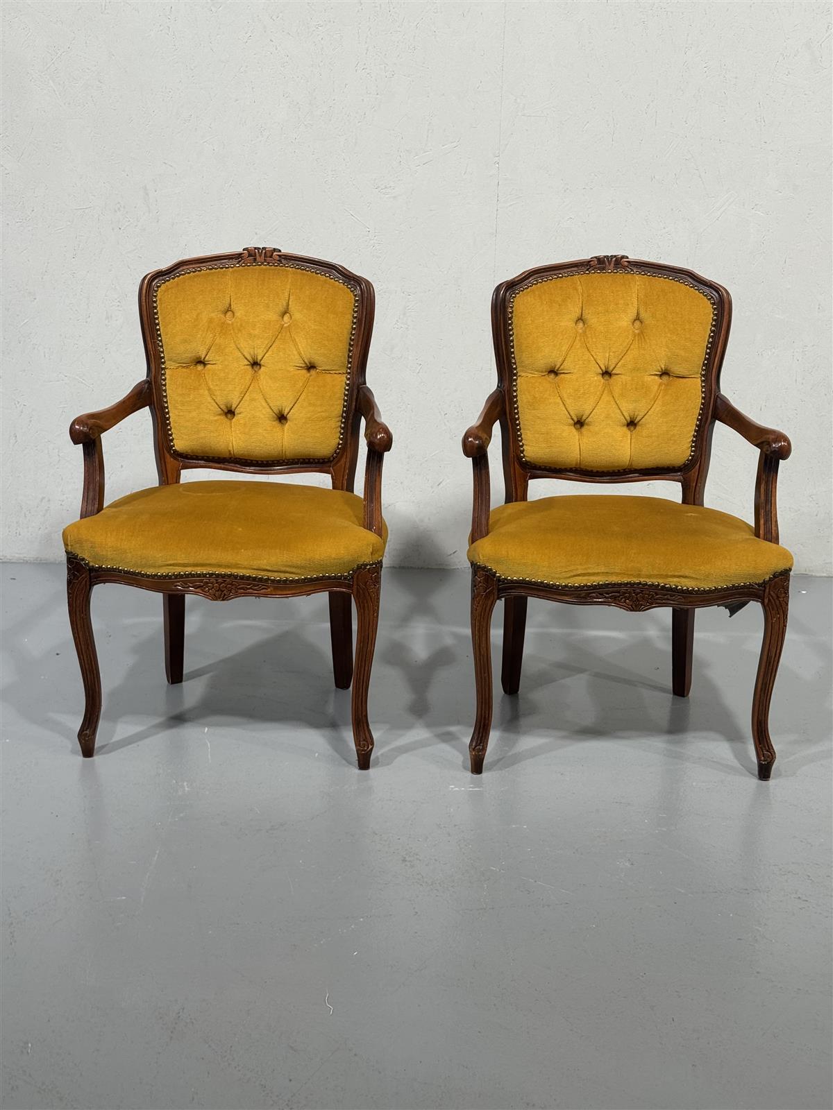 Tyylikkäät rokokoo nojatuolit, joissa on keltainen verhoilu ja koristeelliset puukaiverrukset. Tuolit ovat tukevat ja niissä on mukavat käsinojat, jotka lisäävät istumismukavuutta. Selkänojan napitus tuo klassista ilmettä ja viimeistelee kokonaisuuden. Valmistajaa ei tiedetä.
