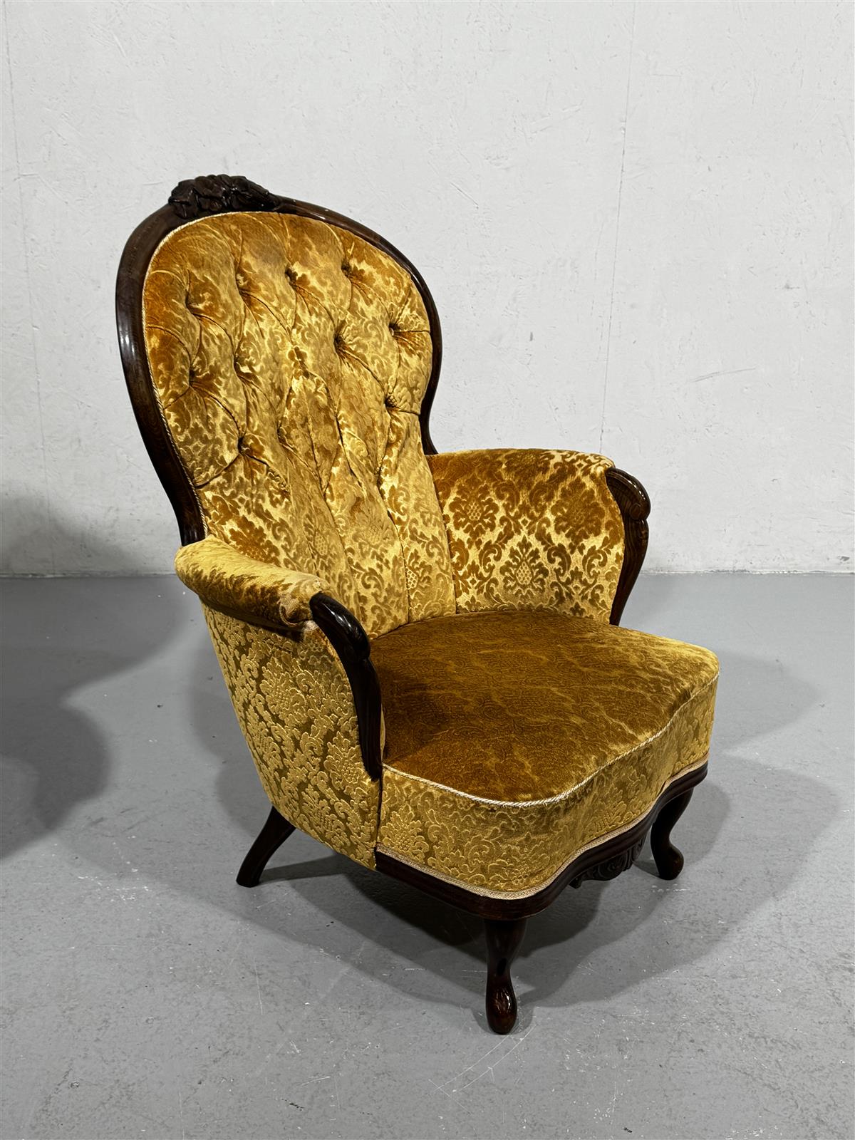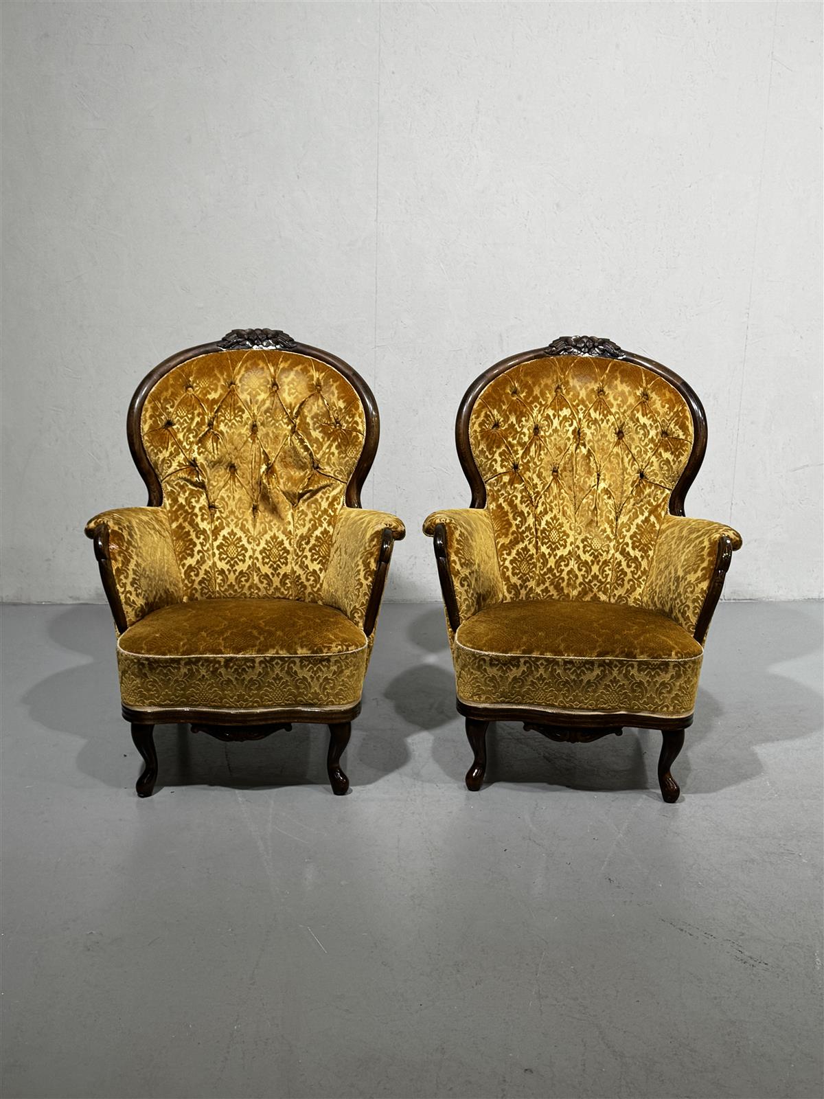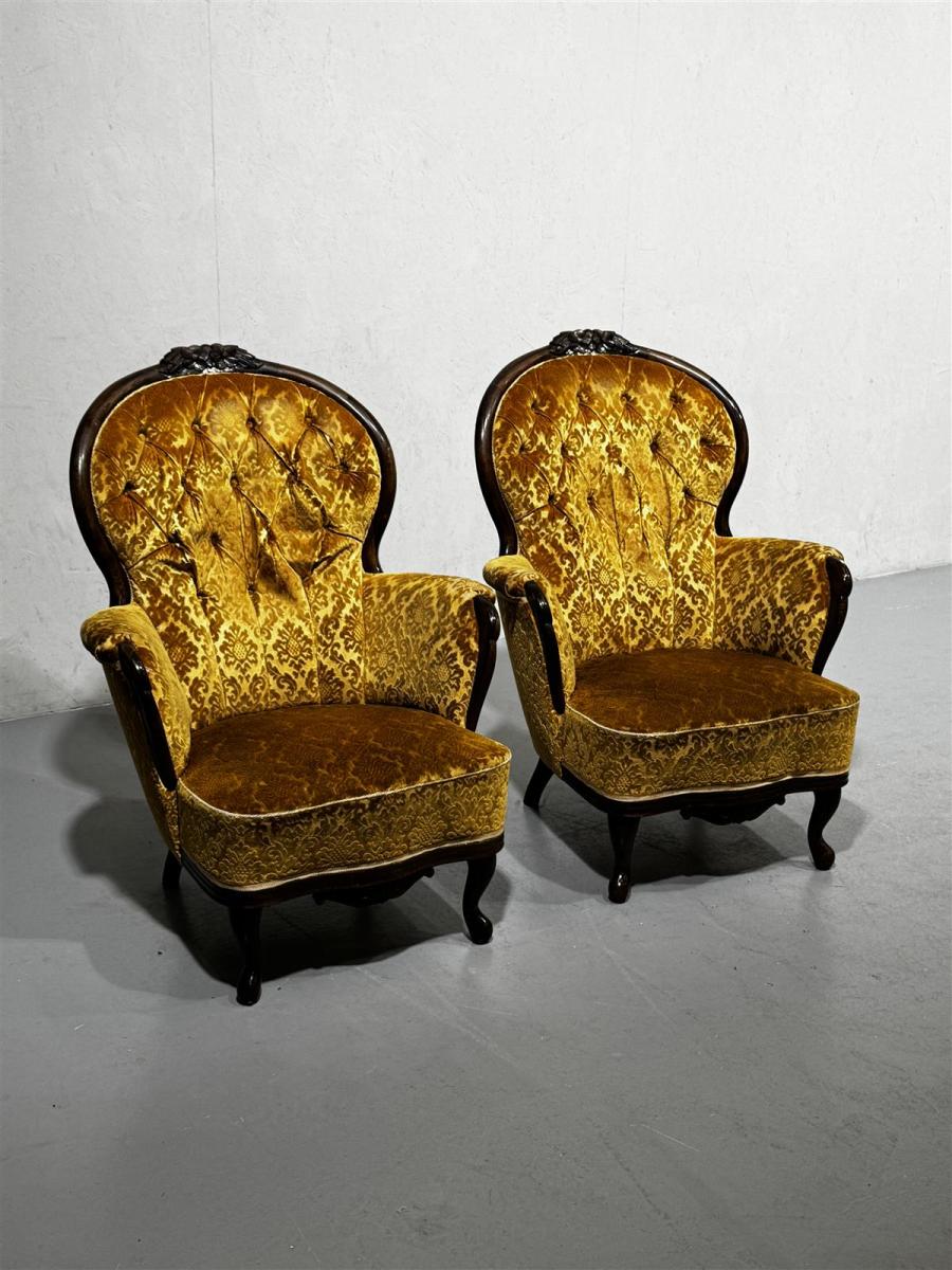 Tyylikkäät vintage rokokoo nojatuolit, joissa on kultainen vakosamettiverhoilu ja koristeelliset puukehykset. Näissä tuoleissa on korkea selkänoja ja pehmeät istuimet, jotka tarjoavat mukavuutta ja tyyliä mihin tahansa tilaan.