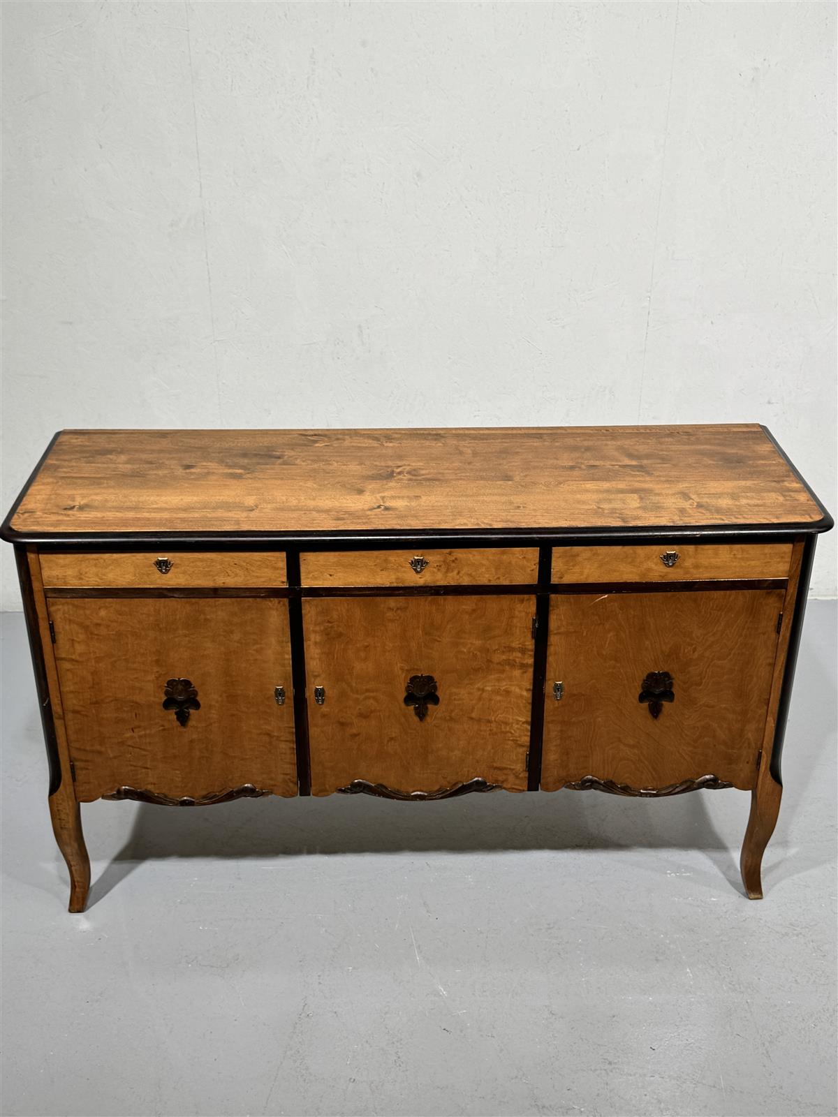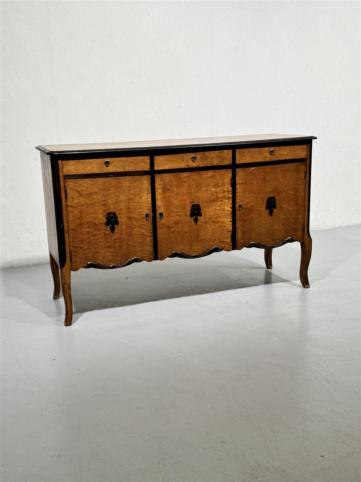 Tyylikäs rokokoo senkki, jossa on kolme ovea ja kolme laatikkoa. Valmistajaa ei tiedetä, mutta senkki on selvästi vanhaa käsityötä ja siinä on koristeelliset yksityiskohdat.