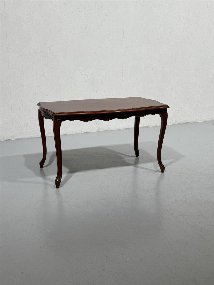 Tyylikäs rokokoo sohvapöytä, joka on valmistettu puusta. Pöydässä on kauniit kaarevat jalat ja koristeelliset reunat, jotka tuovat esiin rokokoon aikakauden muotokielen. Pöydän pinta on sileä ja kiiltävä, mikä korostaa sen hienostunutta ulkonäköä.