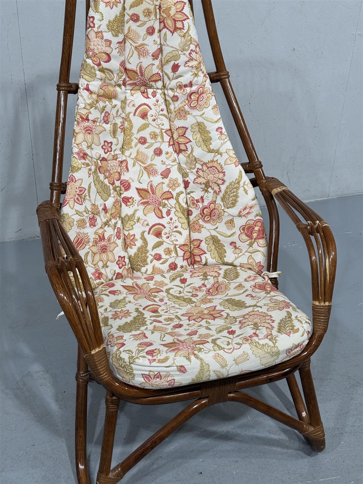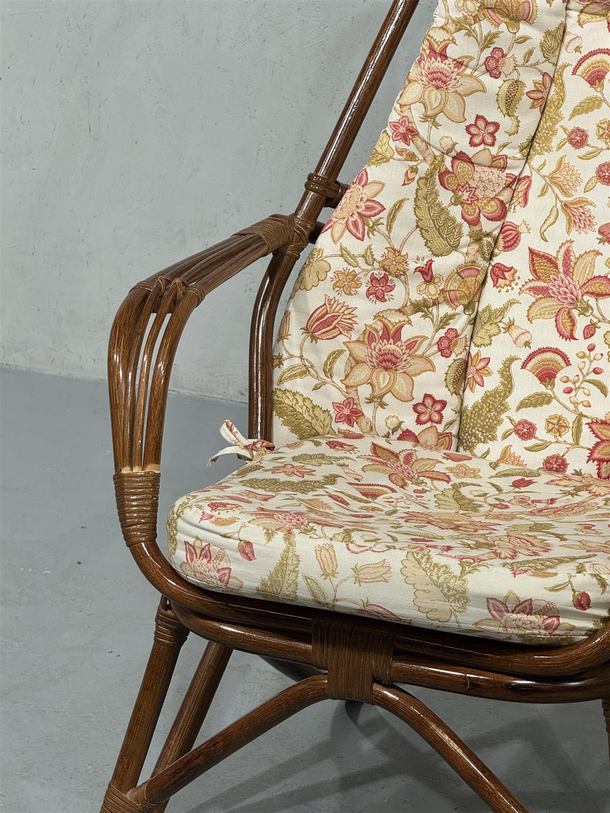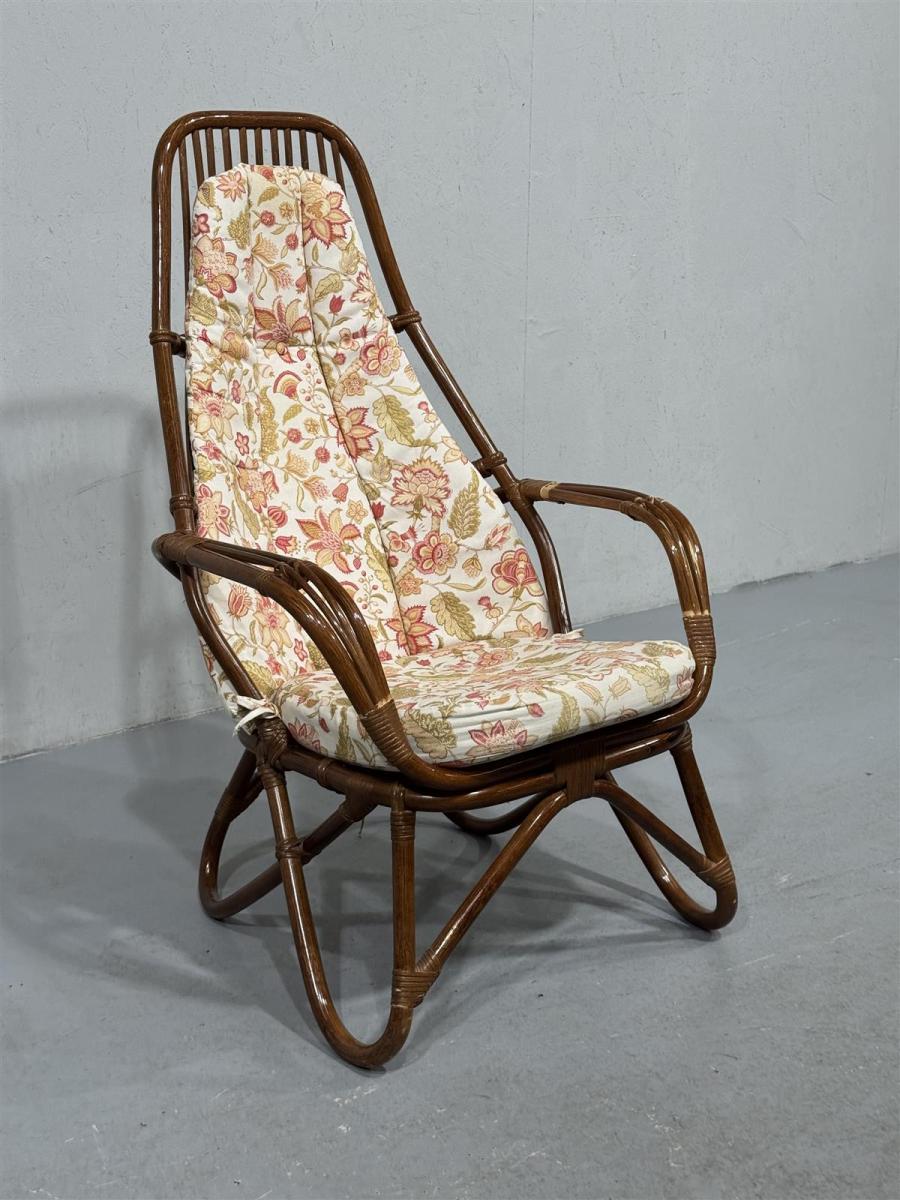 Rottinkituoli, jossa on kukkakuvioinen pehmuste. Tuolin runko on valmistettu rottingista ja siinä on korkea selkänoja.