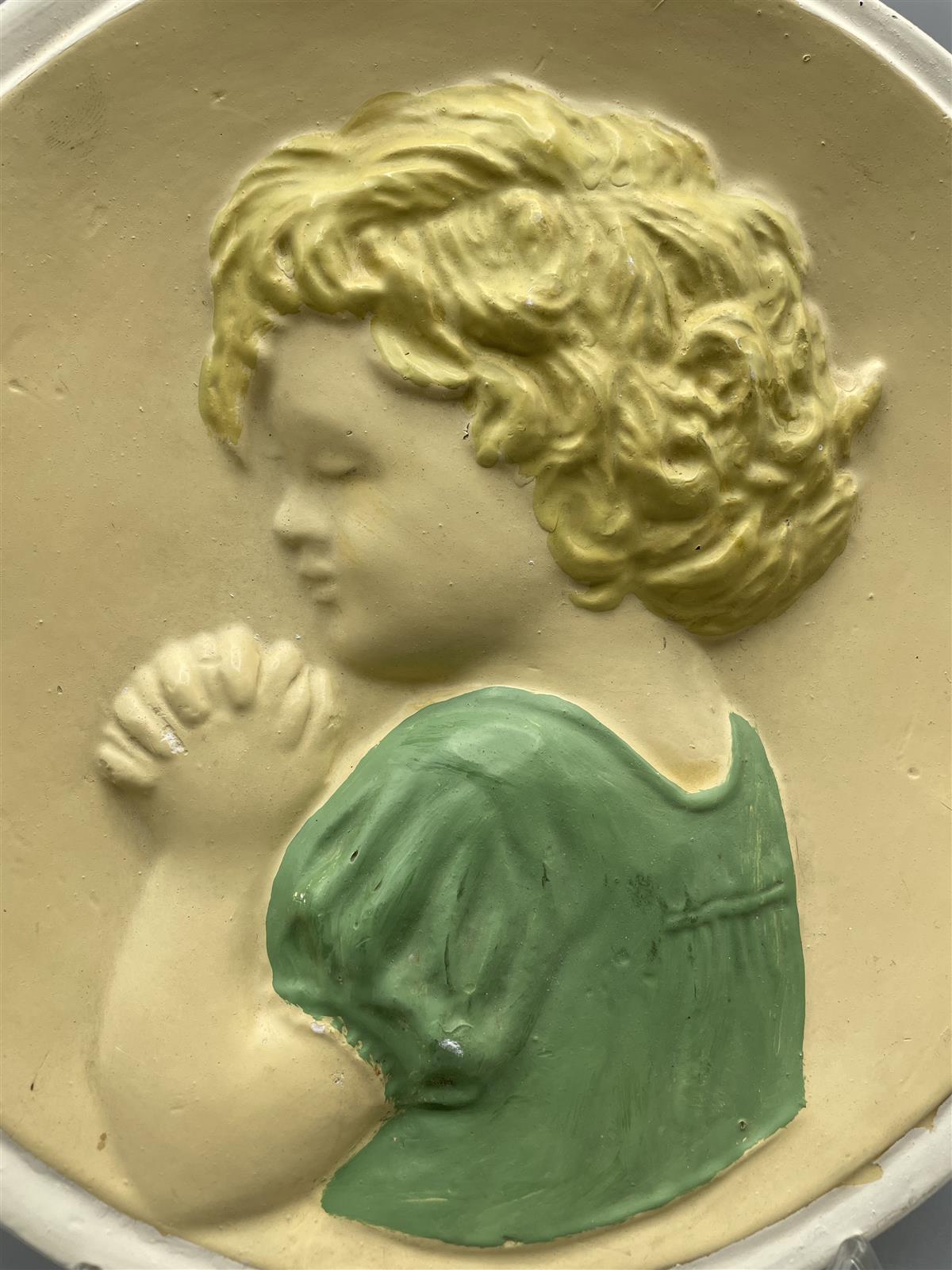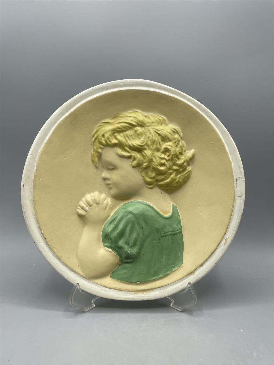 Pyöreä puinen seinälautanen, jossa on kohokuvioitu rukoileva lapsen muotokuva.