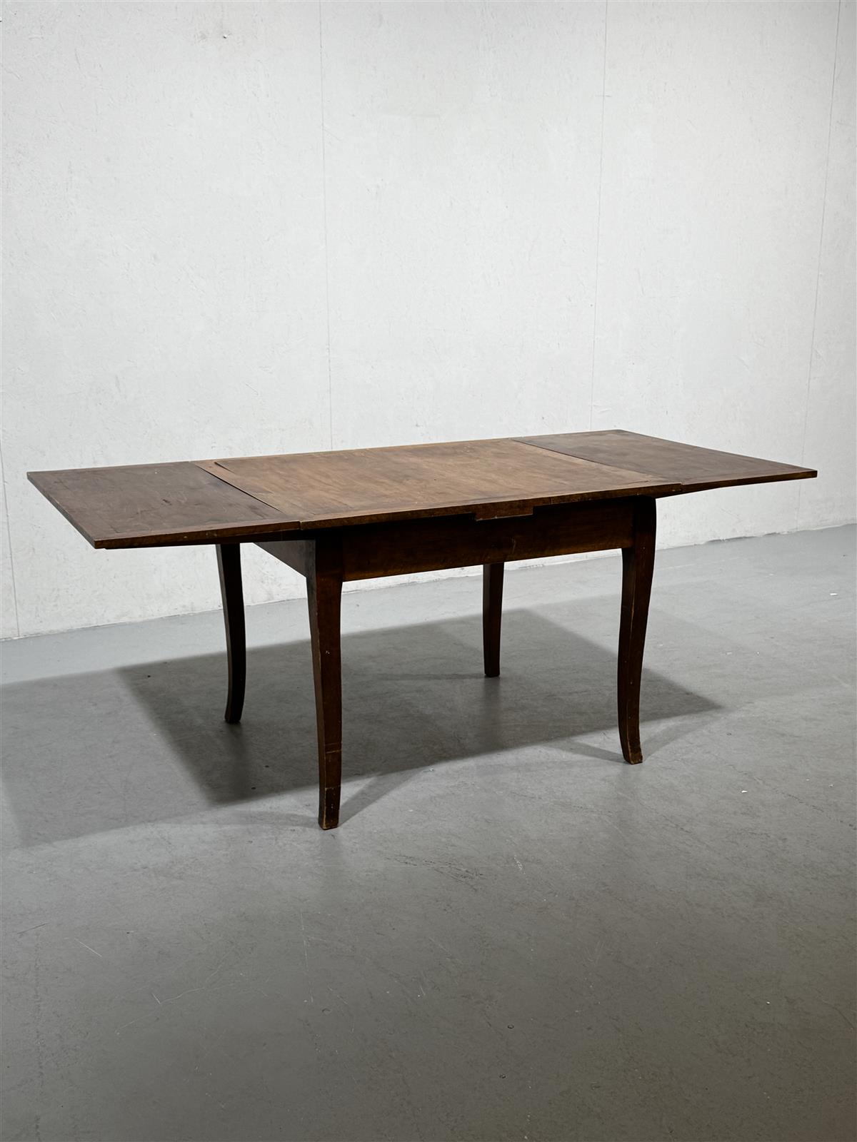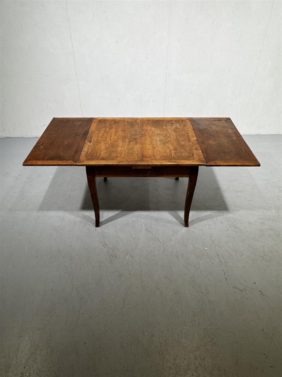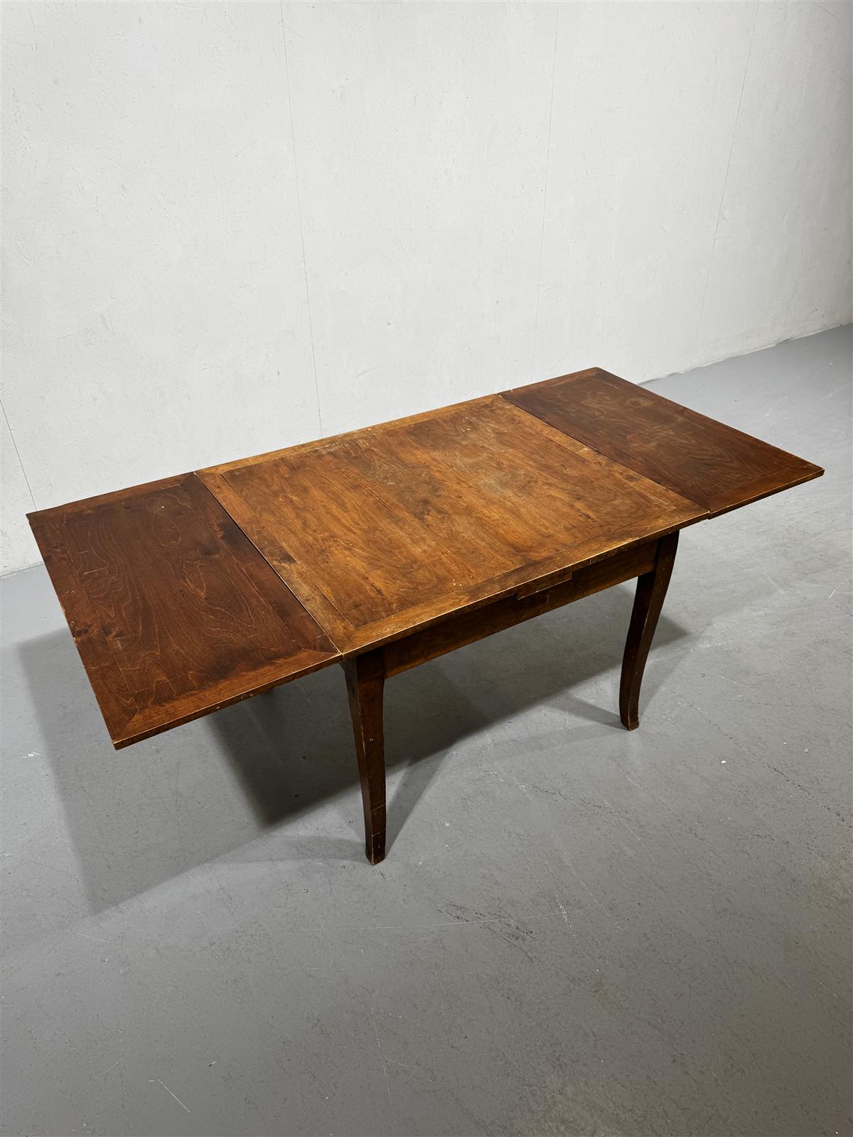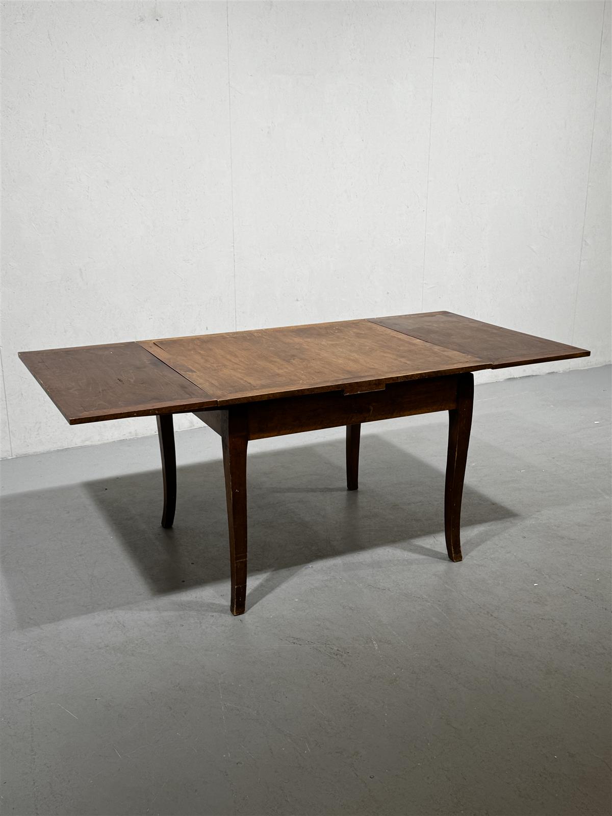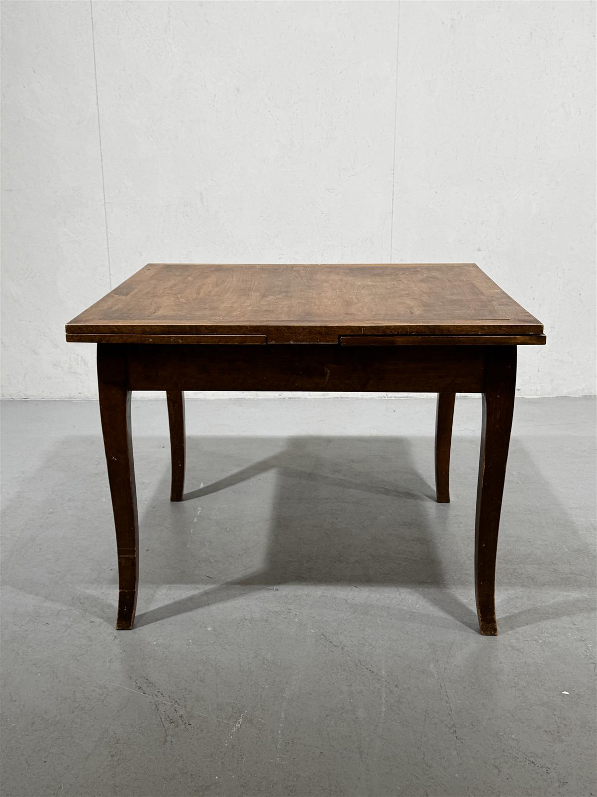 Levitettävä vanha ruokapöytä, jossa on ruskea pinta. Pöydän sivuilta voidaan avata lisätilan saamiseksi levyjä 2 kpl. Pöydän jalat ovat hieman kaarevat ja tukevat rakennetta.