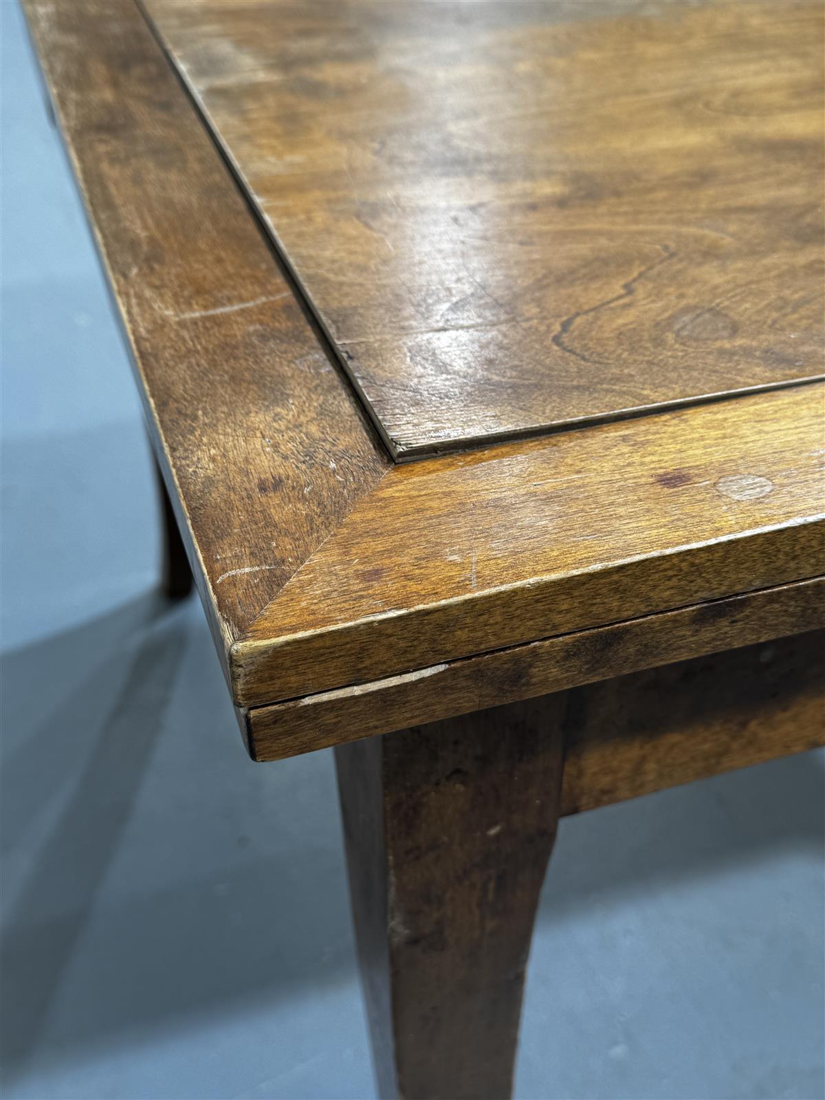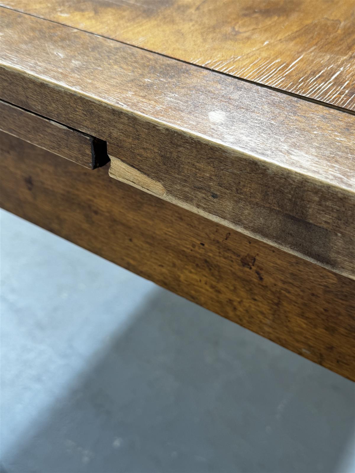 Pöydän pinnassa on kulumaa ja muutama lohkeama. Tason levy on hieman irti keskeltä, mutta pöytä on silti käyttökelpoinen.