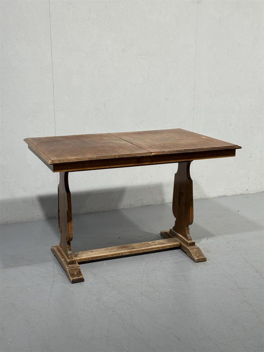 Klassinen vintage ruokapöytä 1900 luvun alkua, jossa on suorakaiteen muotoinen kansi ja koristeiset, tukevat jalat. Pöydän pinta on kulunut ja siinä on näkyvissä käytön jälkiä. Sisältä löytyy 2 jatkopalaa +30cm per pala.