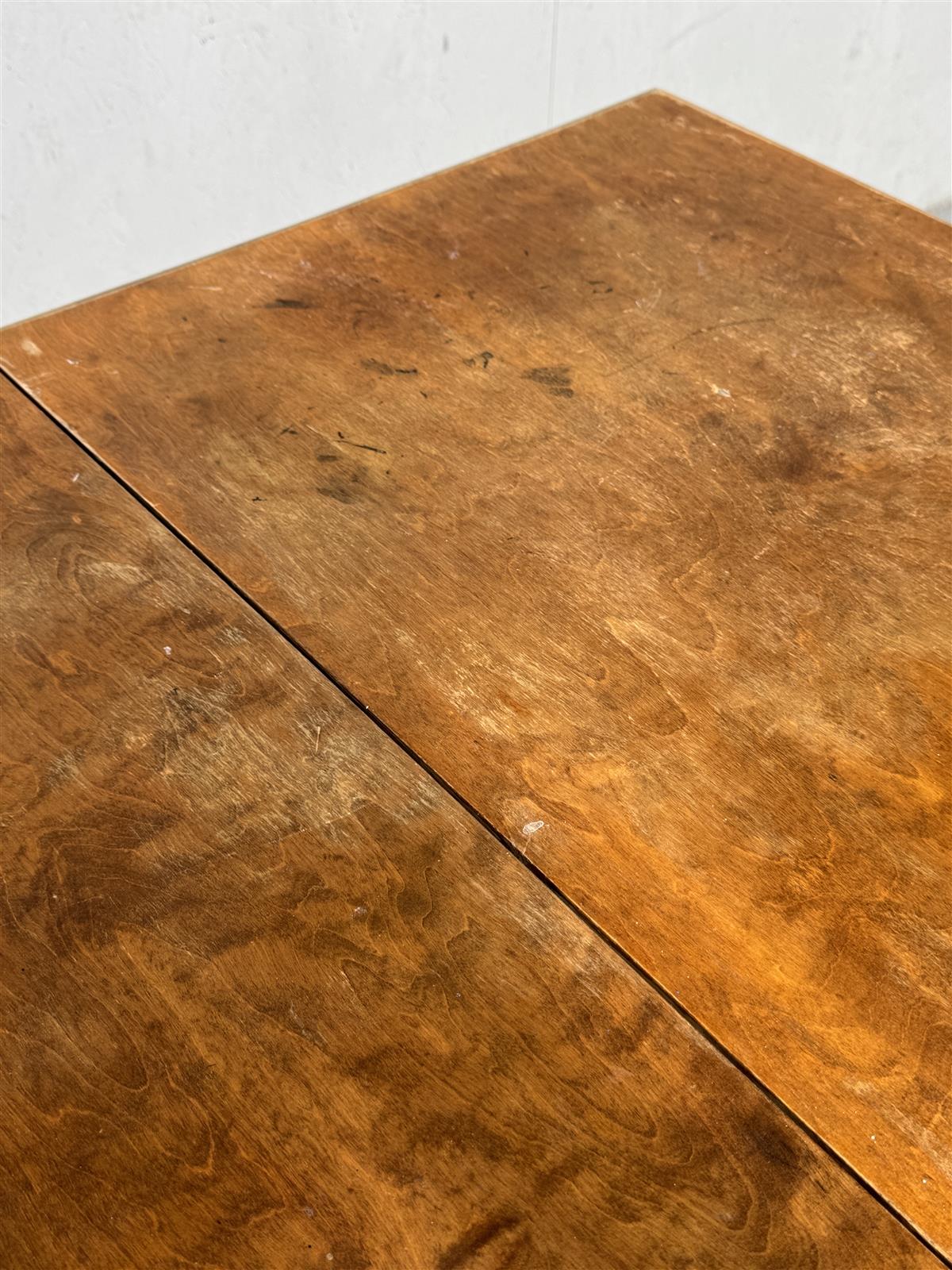 Pöydässä on havaittavissa selkeää pintakulumaa ja naarmuja, mutta se on rakenteellisesti hyvässä kunnossa. Jatkopaloissa likaa pinnalla. Alkuun puhdistus, hionta ja pinnalle öljy niin tässä upea vintage pöytä tarjolla.