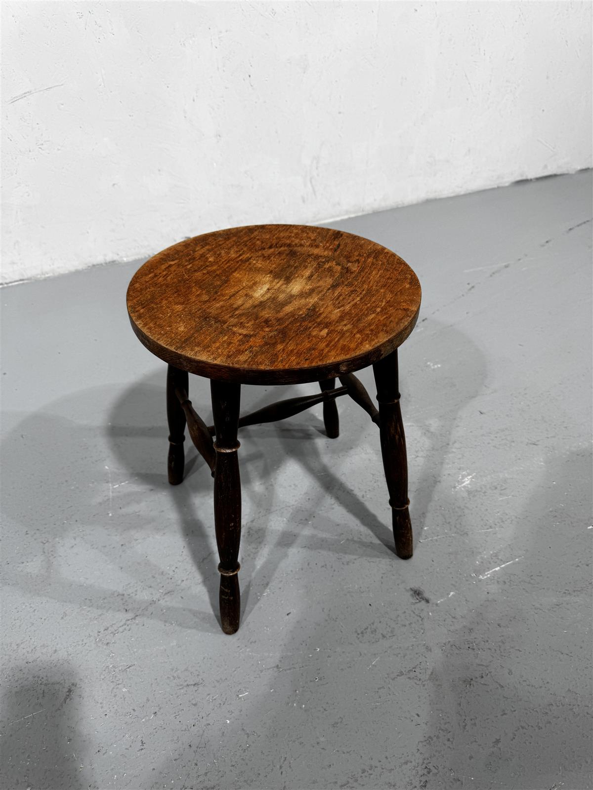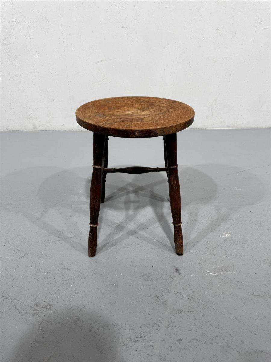 Rustiikkinen puinen jakkara, jossa on pyöreä istuinosa ja neljä sorvattua jalkaa. Jakkara on valmistettu tummasta puusta, joka tuo esiin sen vanhan ajan viehätyksen ja käytännöllisyyden. Tämä jakkara on yksinkertainen mutta toimiva lisä mihin tahansa tilaan, jossa tarvitaan lisäistuinta tai pientä pöytätasoa.