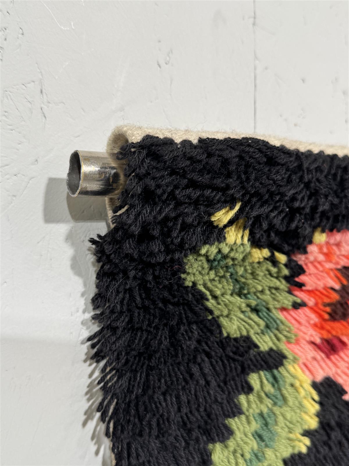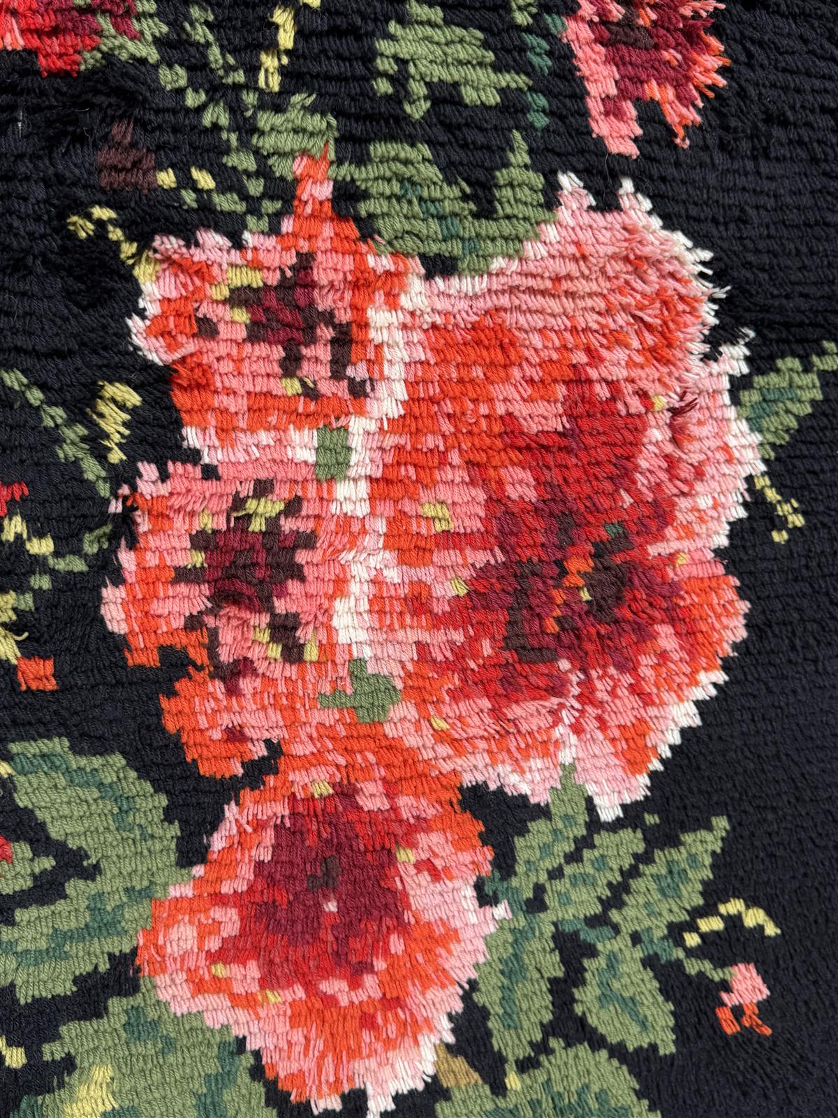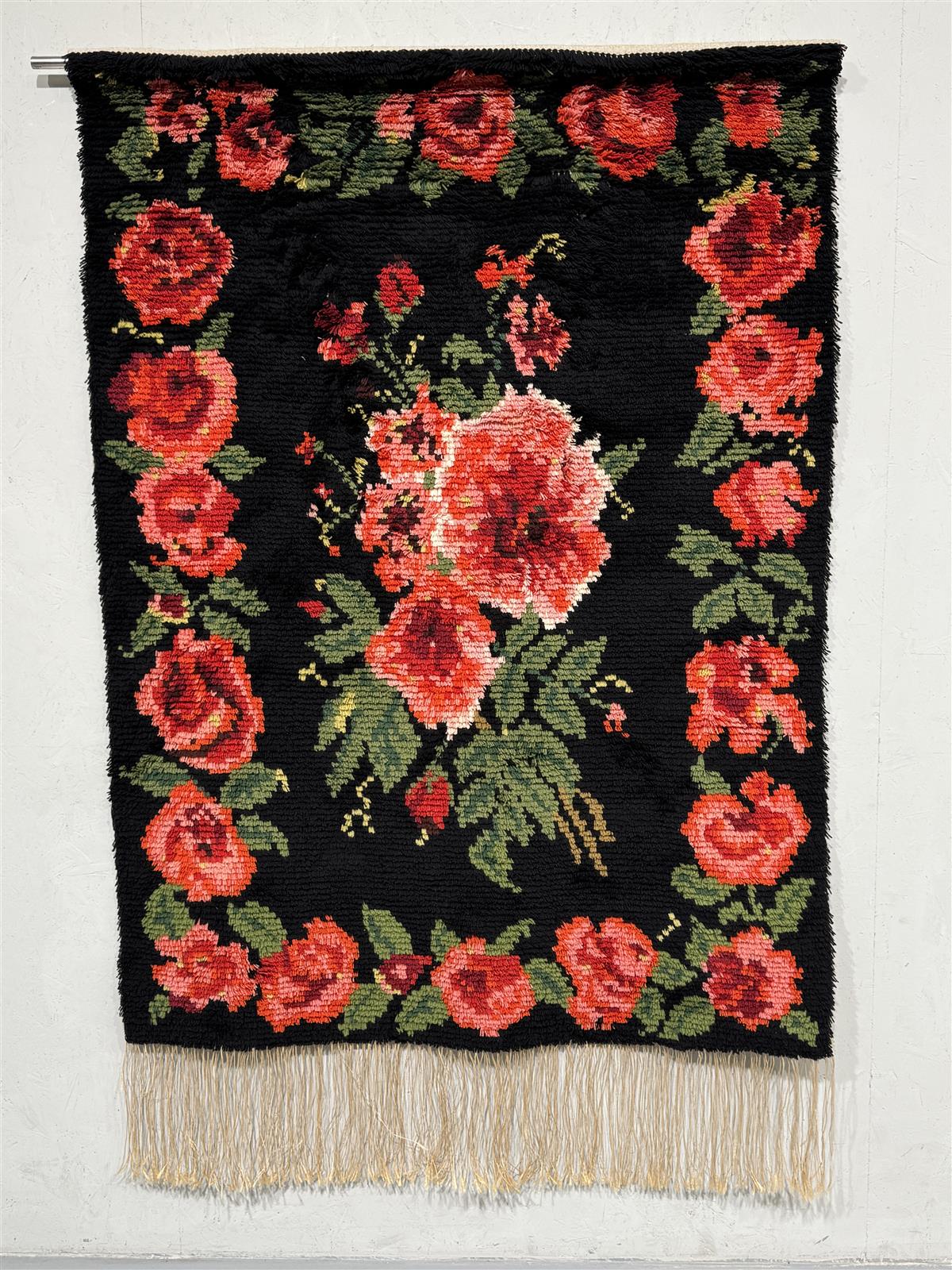 Ruusukuvioinen ryijy, jossa on musta pohja ja punaisia kukkia. Ryijyssä on koristeelliset hapsut alareunassa, jotka lisäävät sen perinteistä ilmettä. Koko on 123×185 cm, mikä tekee siitä näyttävän seinävaatteen tai lattiamaton.