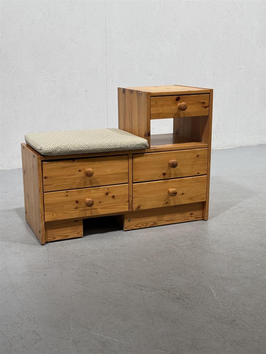 Säilytyspenkki, jossa on neljä vetolaatikkoa ja pehmustettu istuin. Penkki on valmistettu puusta ja siinä on luonnollinen puun väri.
