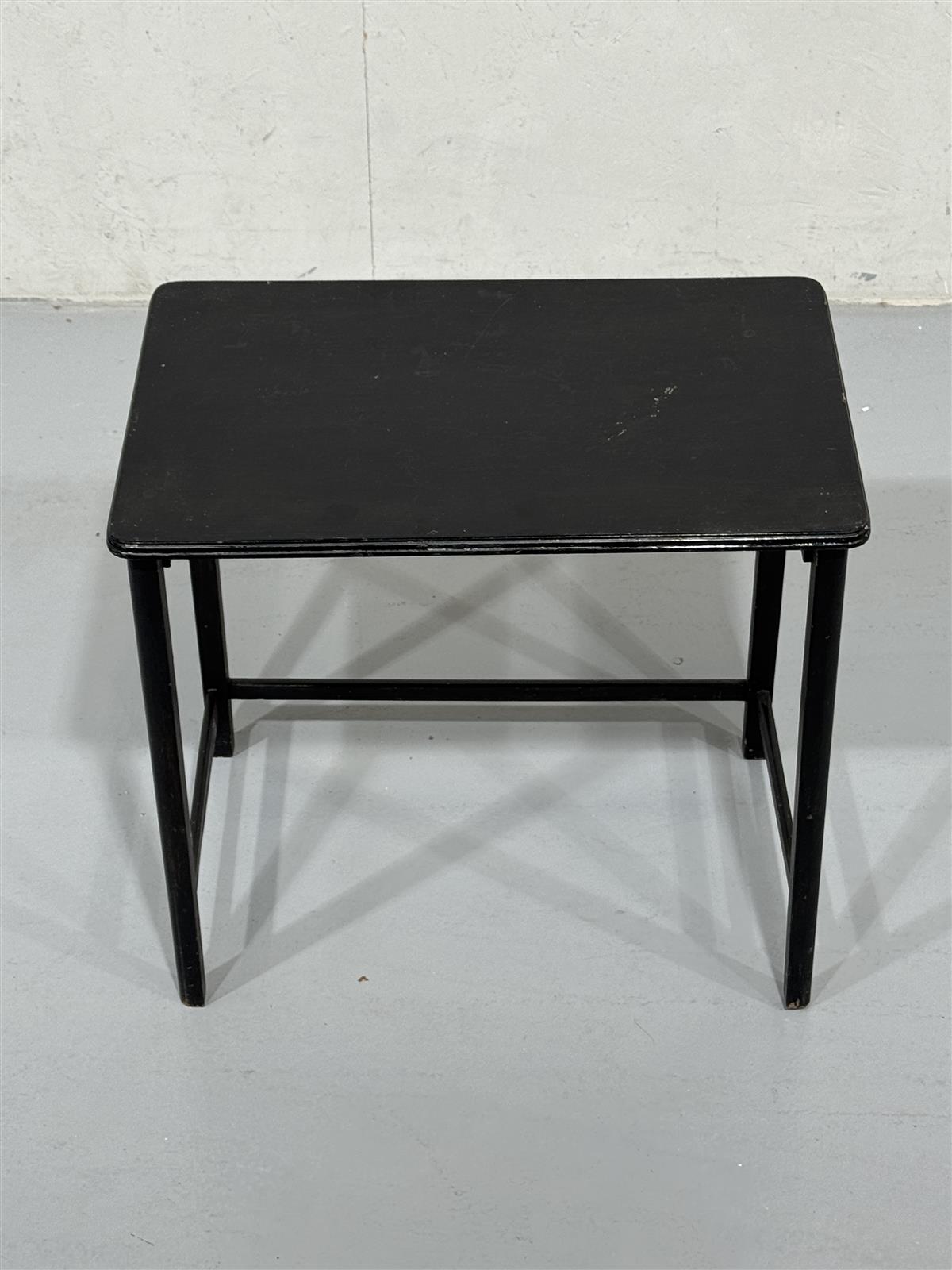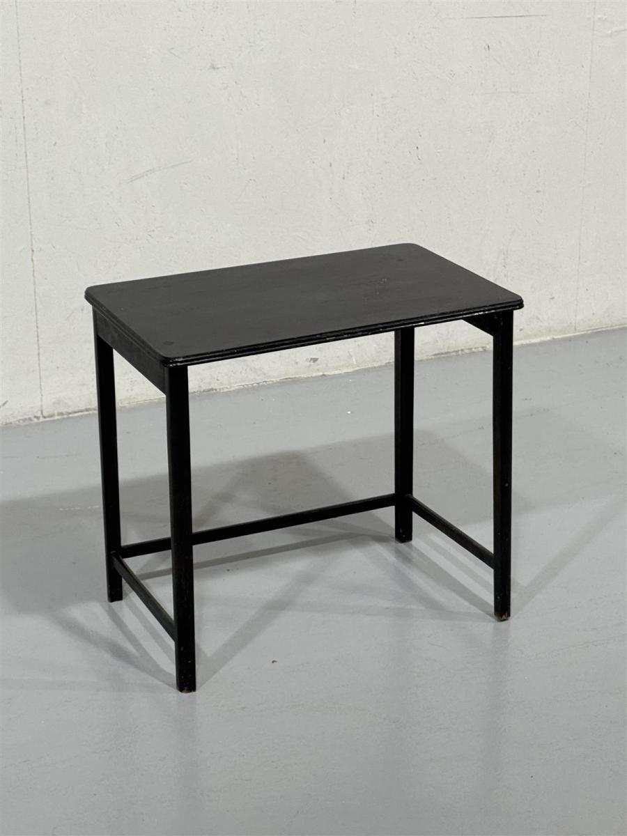 Musta sivupöytä, jossa on yksinkertainen muotoilu ja neljä jalkaa. Pöydän pinta on tasainen ja siinä on hieman kulumaa.