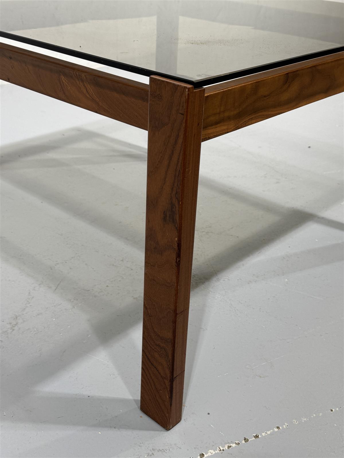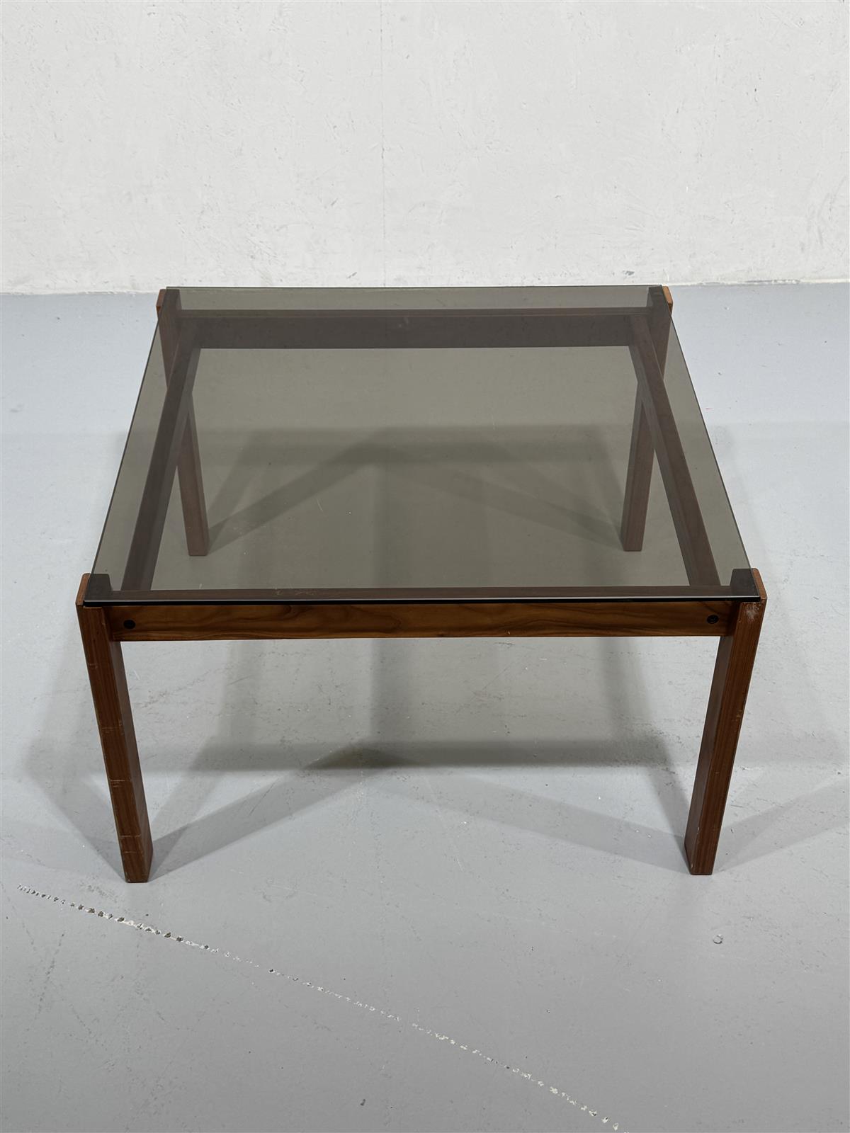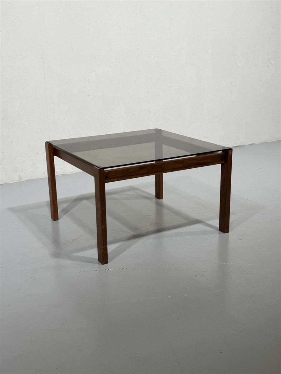 Tyylikäs vintage-sohvapöytä, jossa on palisanterista valmistettu runko ja savulasinen pöytälevy. Pöydän muotoilu on yksinkertainen ja selkeä, mikä korostaa sen ajattomuutta ja käytännöllisyyttä.