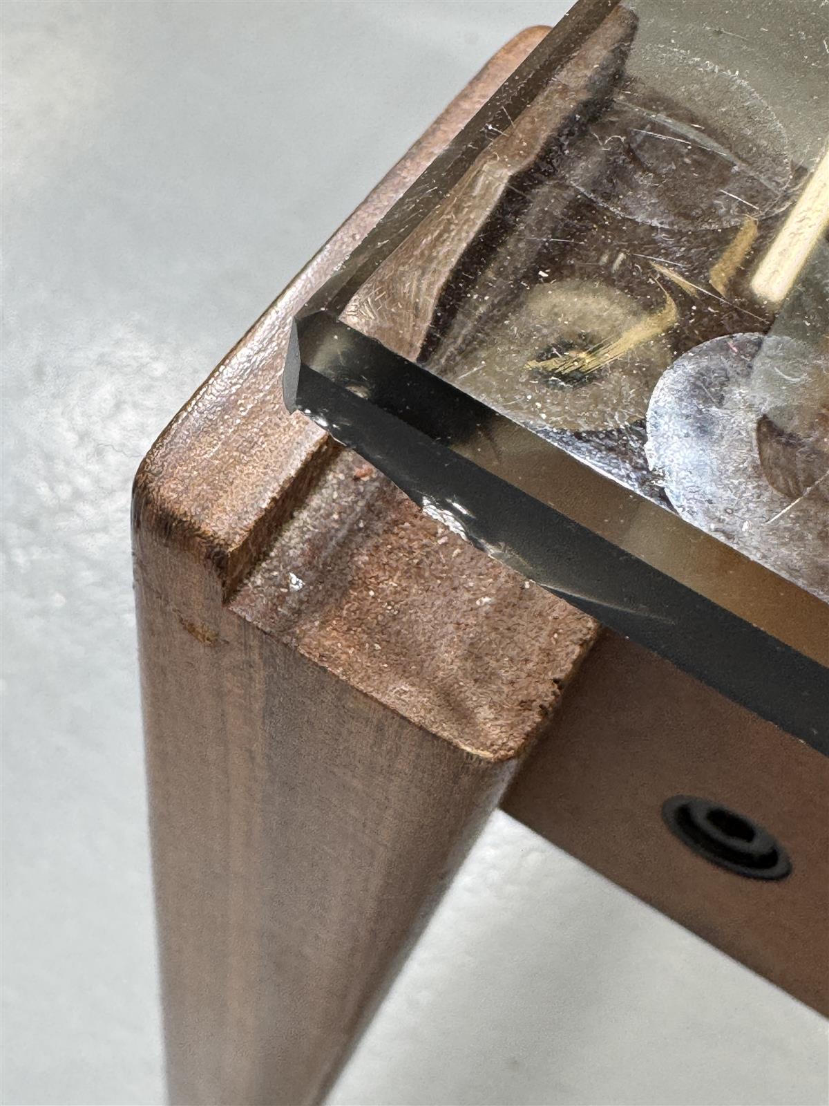 Pöydässä on havaittavissa kulumisen merkkejä, kuten naarmuja ja pieniä kolhuja rungossa. Lasipinnassa on vekki yhden reunan alanurkassa.